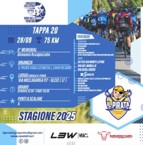 Domenica 28 settembre 2025 si torna in pista con la ventesima tappa del circuito ciclistico Opes Giro dell’Agro Pontino con il Memorial Giovanni Accapezzato, gara organizzata dalla Asd Il Pirata Cosmetal Vangi Sama Ricambi.