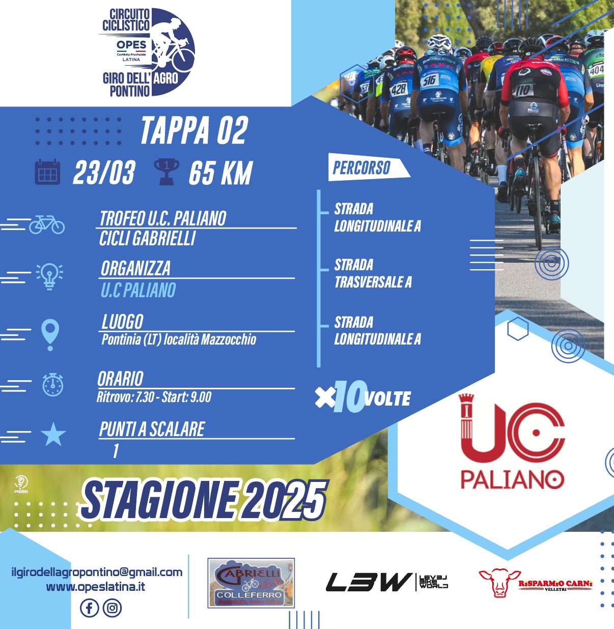 In arrivo la seconda tappa del circuito ciclistico Opes Giro dell’Agro Pontino. Domenica 23 marzo 2025, si correrà il Trofeo U.C. Paliano Cicli Gabrielli, organizzato dalla società new entry nel circuito.