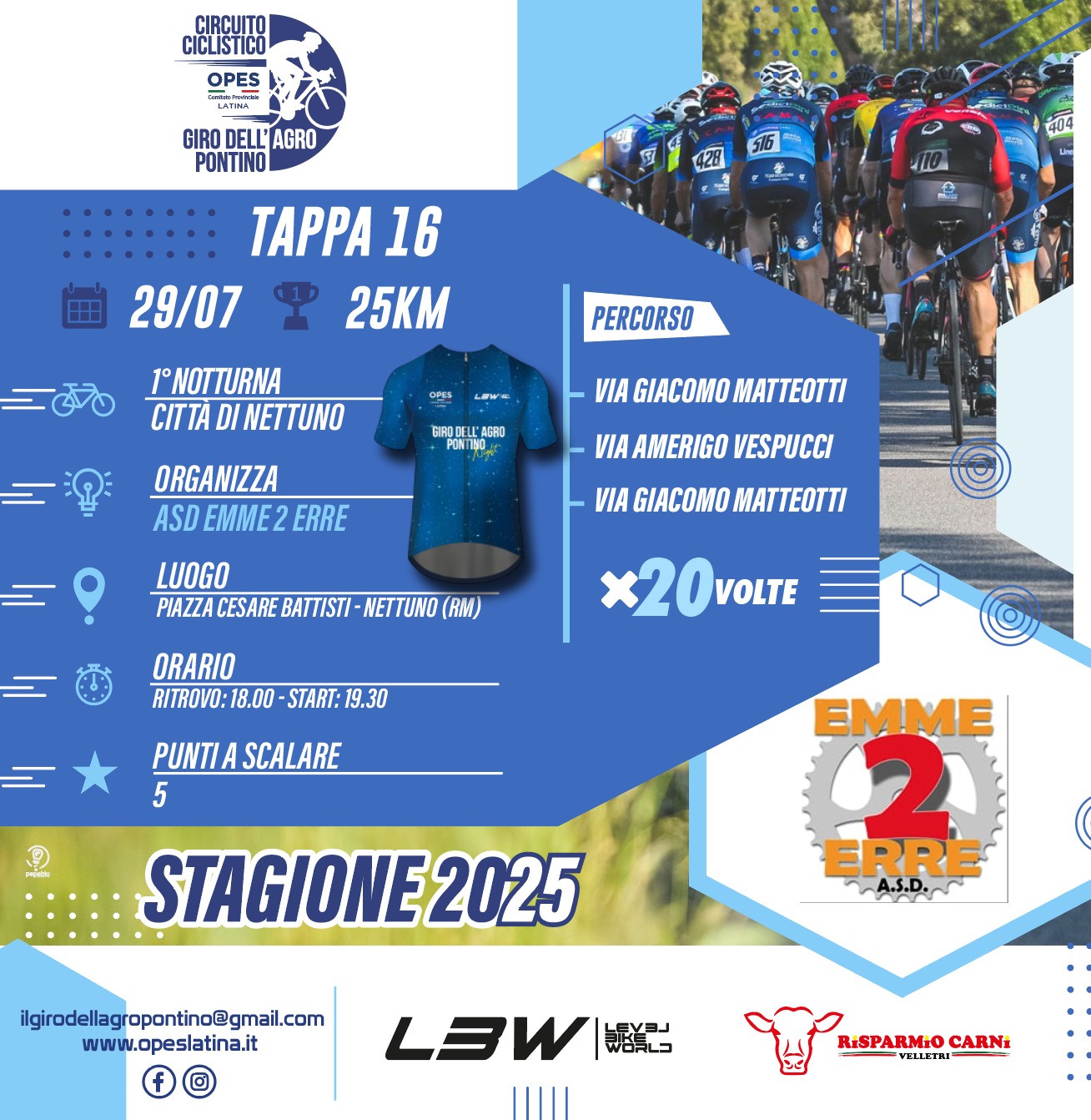 Occhi puntati su questa tappa, che si preannuncia come uno degli eventi più attesi del Giro dell’Agro Pontino Opes, dove i vincitori saranno omaggiati della maglia dedicata al giro by night. Il ritrovo è per le ore 18 presso Piazza Cesare Battisti, Nettuno (RM), con partenza alle ore 19:30. Il percorso è suddiviso tra le strade Via Giacomo Matteotti, Via Amerigo Vespucci, Via Giacomo Matteotti e saranno 20 i giri da totalizzare per arrivare ai circa 25 km di tracciato previsto. La gara scalerà nr. 5 punti.