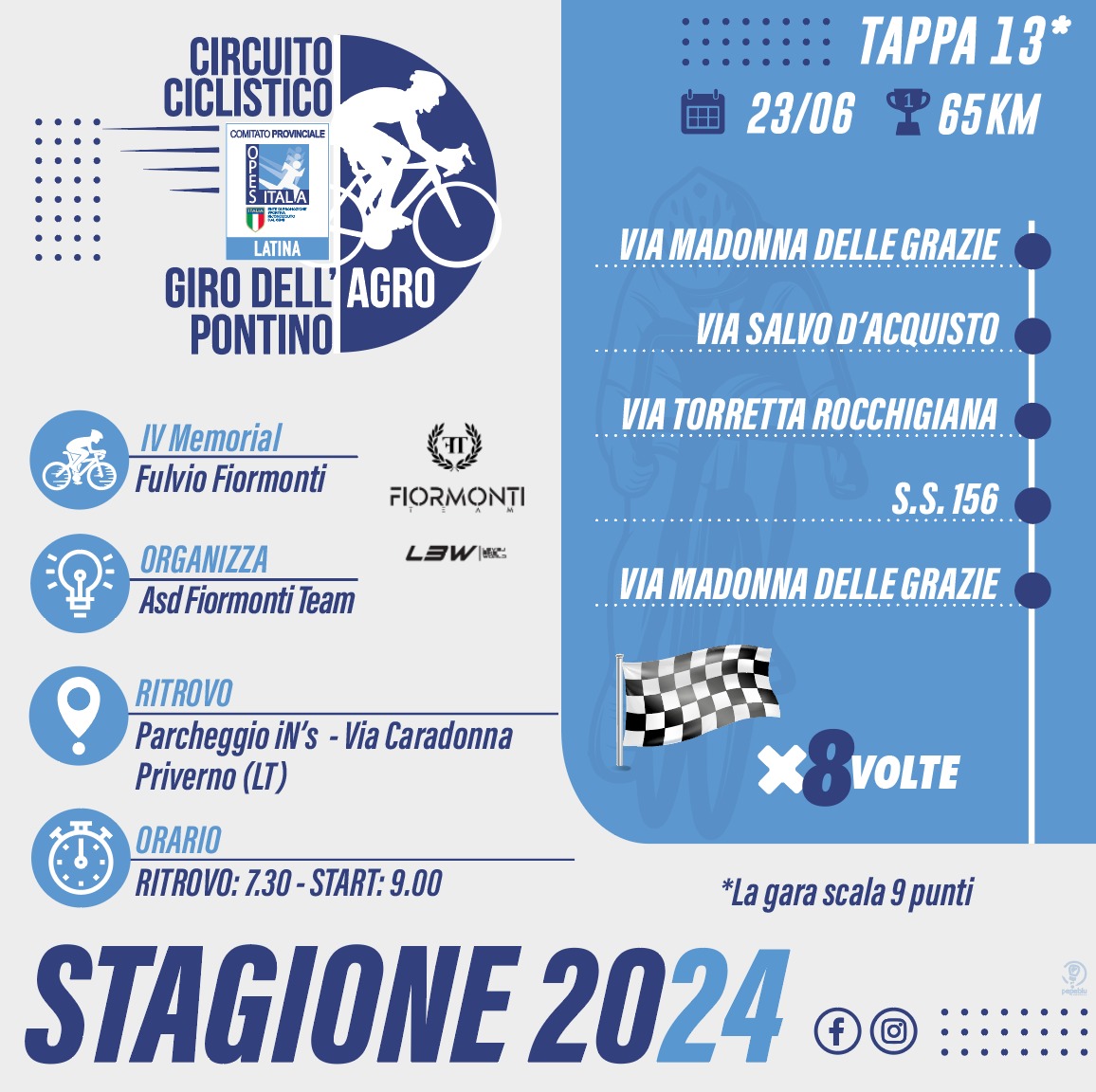 Il Giro Dell’Agro Pontino presenta l’ultima tappa prima della pausa estiva in programma domenica 23 giugno 2024. Si correrà il IV Memorial Fulvio Fiormonti, a Priverno, sotto l’organizzazione della Asd Fiormonti Team, tappa numero tredici del circuito ciclistico Opes.