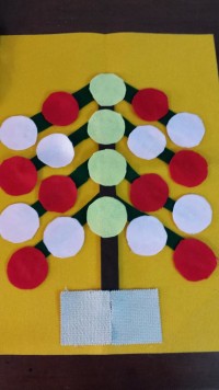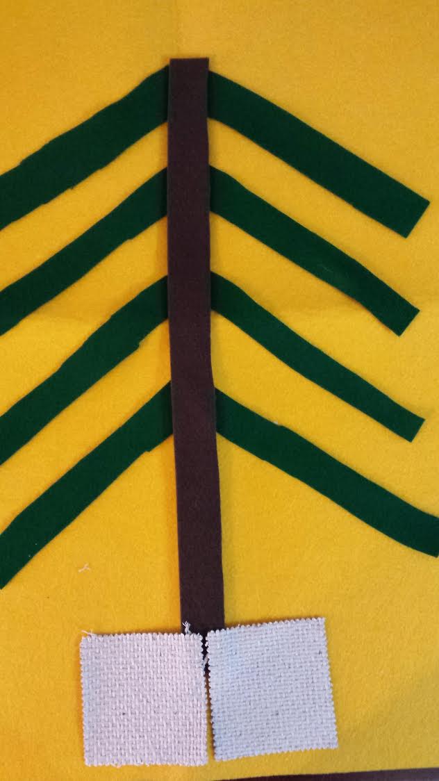 Poggiate sulla base i pezzi appena ritagliati e iniziate a comporre il vostro albero incollando le varie parti con la colla per tessuti. Volendo si potrebbero anche cucire , ma i miei progetti vogliono essere il più semplici possibile , anche perché il bello sarebbe che fossero proprio i bambini a realizzarli sotto la vostra supervisione