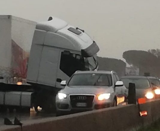 Camion urta lo spartitraffico, pioggia di cemento sulla Pontina