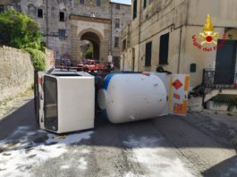 Terracina, autocisterna con 2500 litri di gpl si ribalta nel centro storico