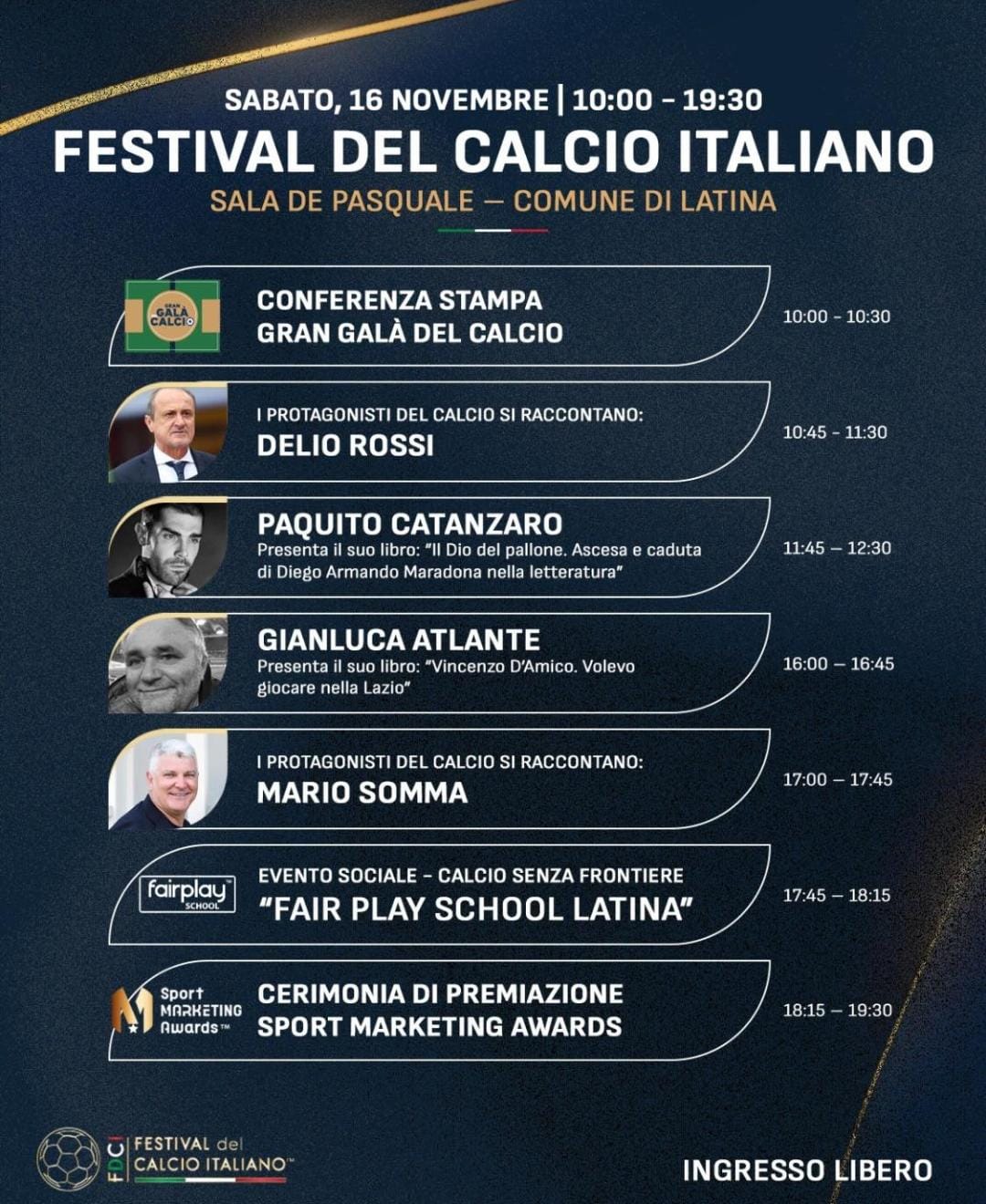 Domani, sabato 16 novembre, presso la Sala De Pasquale del Comune di Latina, si aprirà il Festival del Calcio Italiano, un evento dedicato a tutti gli appassionati del calcio e della cultura sportiva. L’ingresso è libero, e l’iniziativa prevede una serie di appuntamenti che vedranno protagonisti alcuni dei nomi più importanti del calcio italiano.