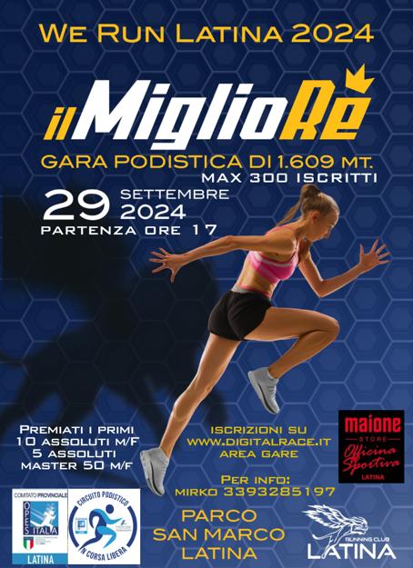 Non solo una location ma anche una competizione unica nel suo genere, infatti gli atleti si sfideranno sulla distanza dei 1609 metri, ovvero un 1 miglio, da qui il nome della gara WE RUN LATINA IL MIGLIO..RE!