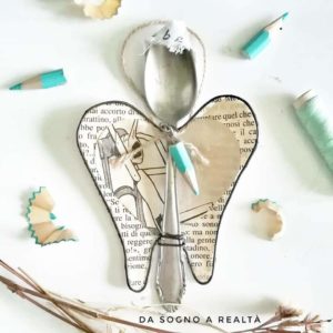 Il materiale principale che utilizzo per le mie creazioni sono i libri antichi che unisco ad altri oggetti del passato ( cucchiaini, stampi da cucina, chiavi, merletti, bottoni, etc.)