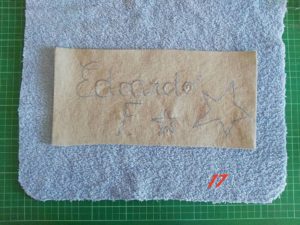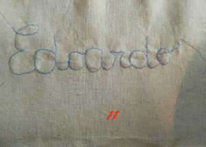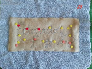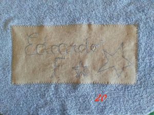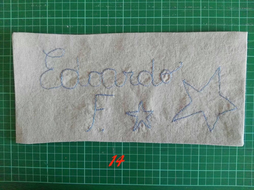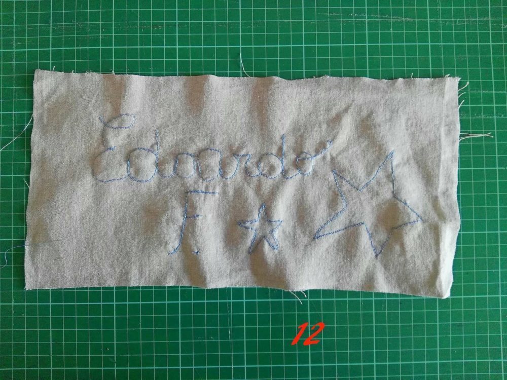 Io ti consiglio di ripassare sulla scritta almeno 3 volte avrai un’effetto di scrittura irregolare molto bello. A fine cucitura taglia i fili in eccesso e stira.