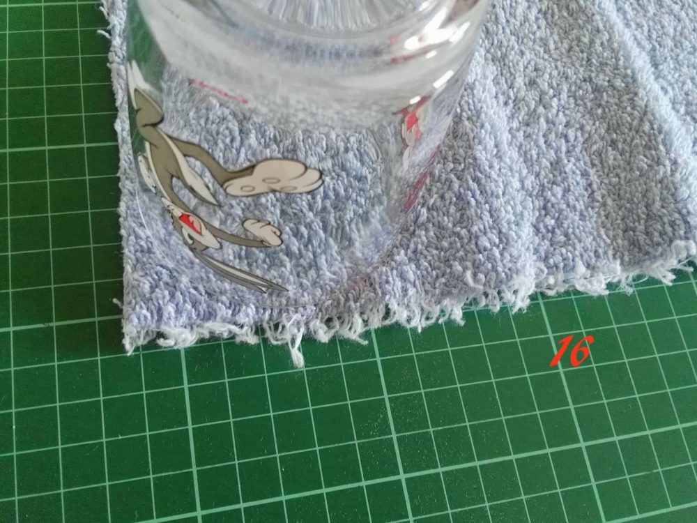 Prendi ora il bicchiere, posalo agli angoli e segna il contorno del bicchiere per arrotondare l’angolo (foto 16)…esegui questa operazione su 3 angoli e uno lo lasci a spigolo.