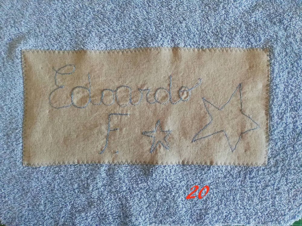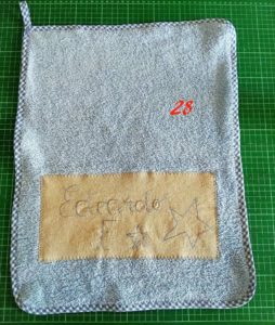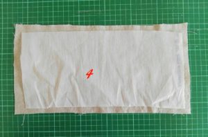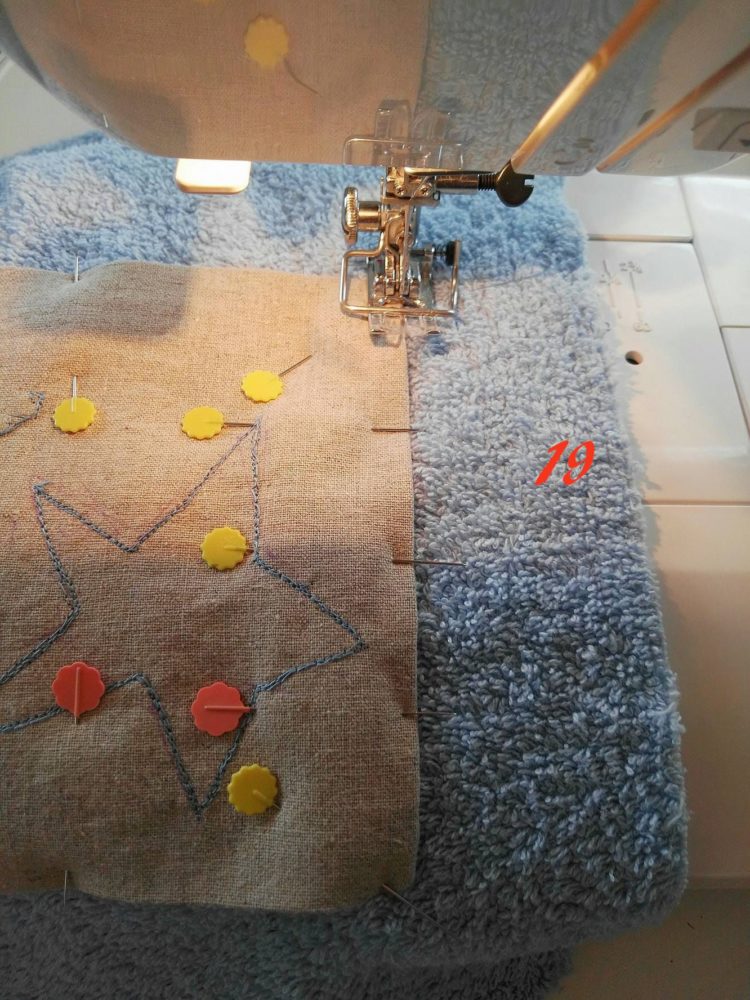 Posiziona il tessuto dove hai ricamato il nome (foto 17) ferma con gli spilli (foto18) [se sei più comoda puoi pure imbastire].