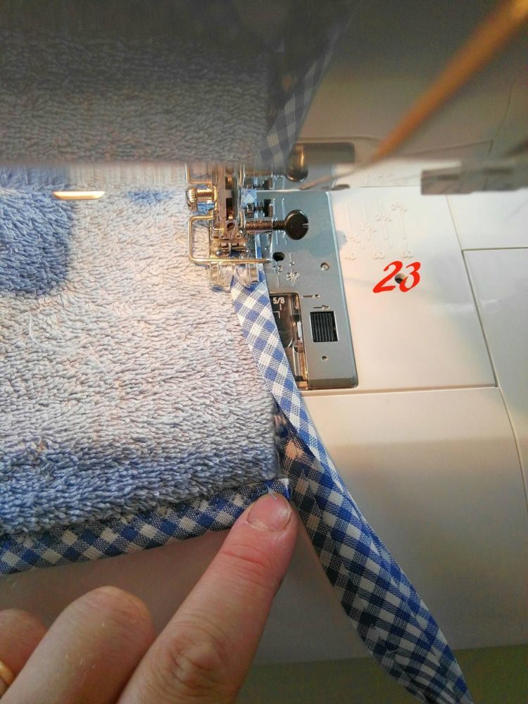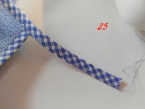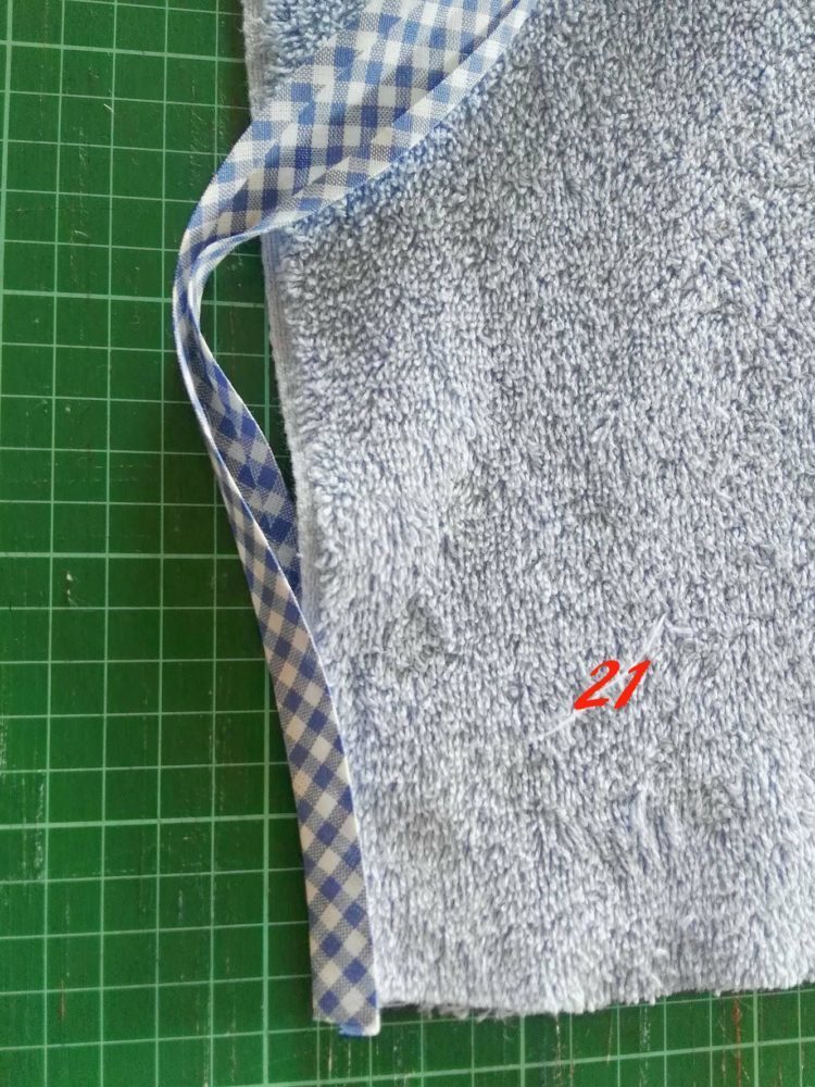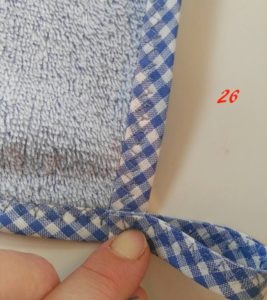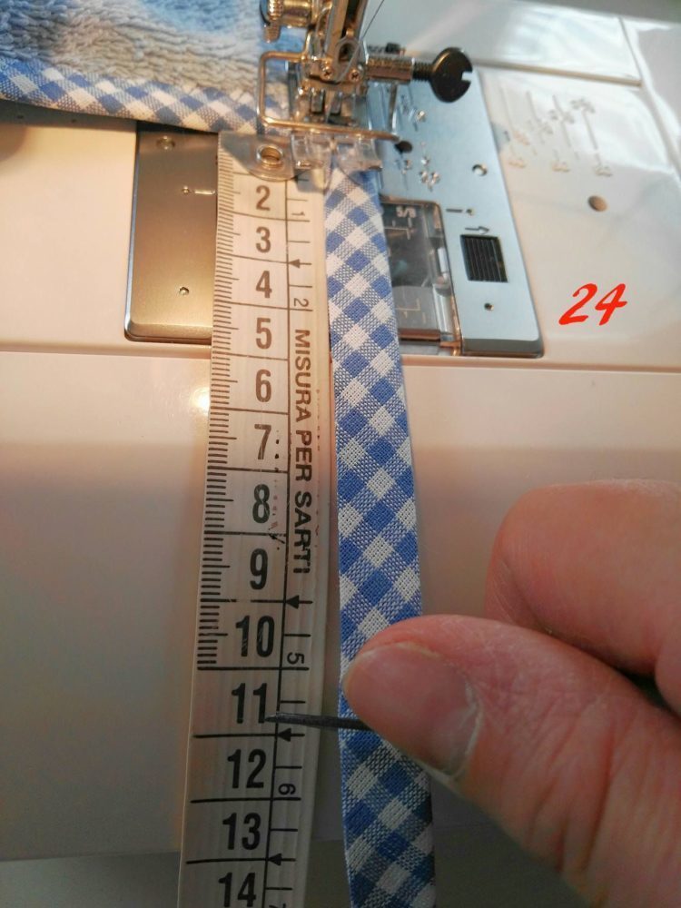 Ora prendi lo sbieco (te ne servirà tanto quanto il perimetro dell’asciugamano più 10/11 cm per la fettuccia), partendo dall’angolo retto posizionalo (foto 21)