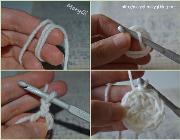 Avviare con cerchio magico (fare un anello di 2 giri intorno a due dita e qui lavorare le maglie