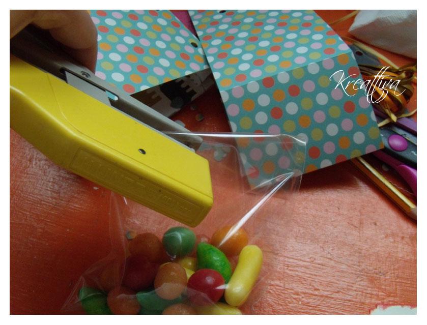 Inserite nella bustina alimentare le vostre caramelle preferite, spillate e con l’aiuto del punzonatore create 2 fori che vi aiuteranno non solo a decorare ma anche a tenere insieme la scatolina con la bustina piena di caramelle.