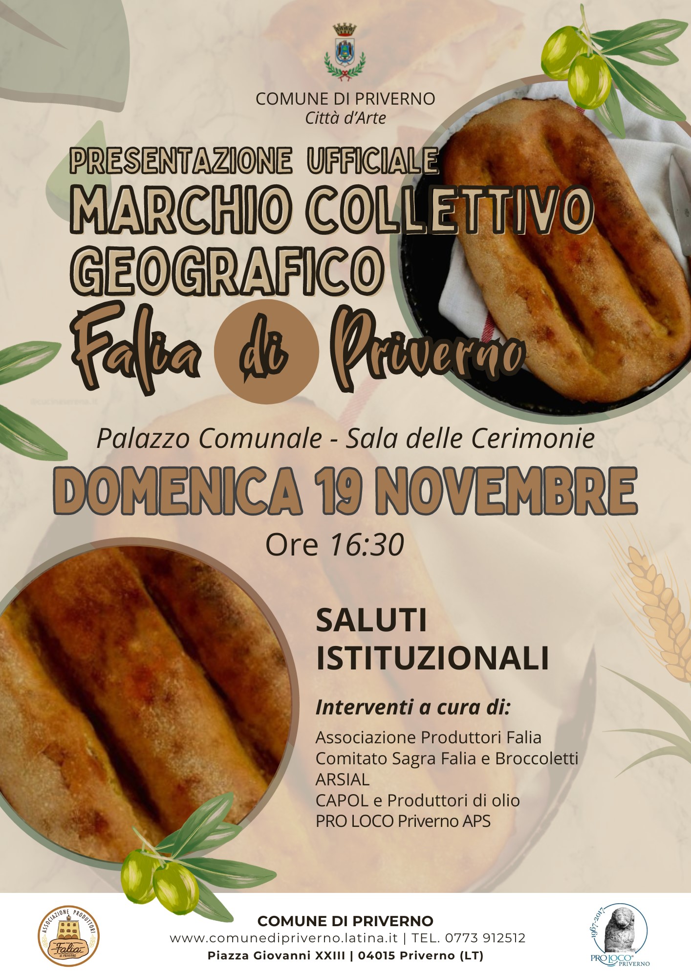 Appuntamento a domenica 19 novembre, alle ore 16.30 presso la sala delle cerimonie del Palazzo Comunale di Priverno per la presentazione de ”il marchio e logo ufficiale MCG ”Falia di Priverno”. Saranno presenti l’Amministrazione comunale, insieme all’Associazione Produttori Falia, alla Pro Loco Priverno, al Comitato Sagra Falia e i rappresentanti dell’Arsial e della Capol.