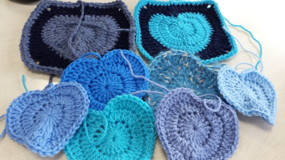 Io li ho fatti utilizzando degli avanzi di lana ma voi potreste decidere di fare i cuori tutti di uno stesso colore e i quadrati di un altro. O comunque in qualsiasi modo la vostra fantasia vi suggerisce.