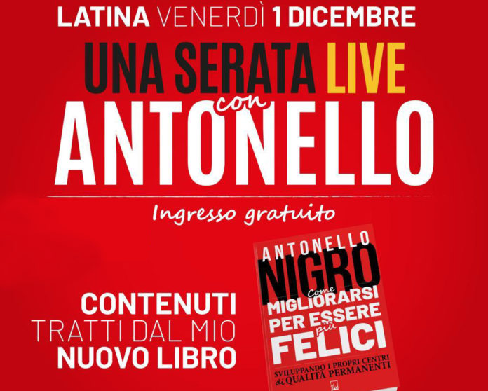 Due ore in compagnia di Antonello Nigro e il suo nuovo libro, l’appuntamento quest’oggi al Circolo Cittadino di Latina. Il mental coach accompagnerà il pubblico per due ore, invitandolo a concentrarsi su abitudini e i comportamenti che quotidianamente influenzano in maniera diretta e indiretta il senso di gratificazione e realizzazione che dovrebbe appagare ciascun individuo.