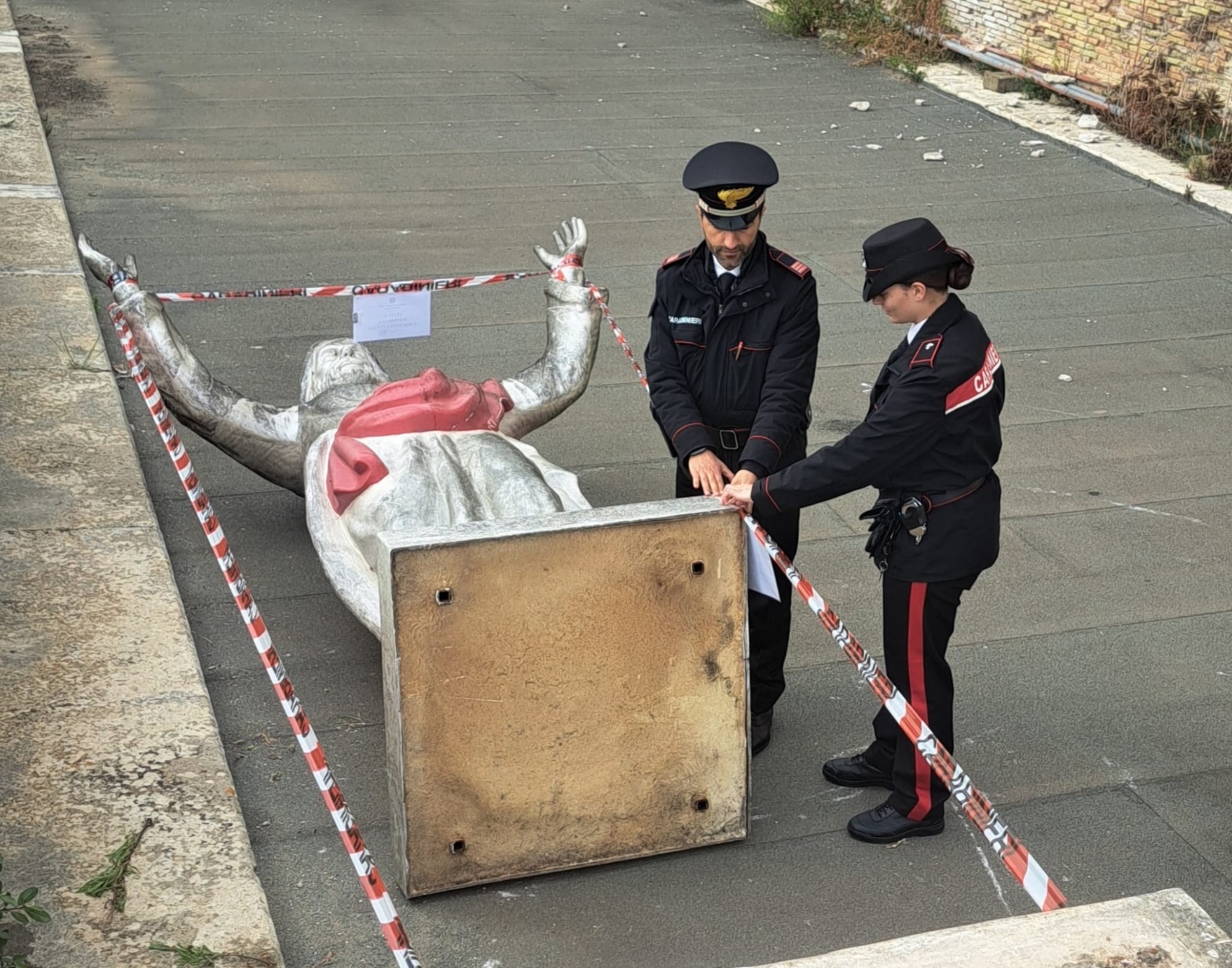L’indagine è stata avviata dopo la querela presentata da una donna del luogo, proprietaria di un lastrico solare su Palazzo Braschi, finito al centro della vicenda. Secondo quanto emerso, l’uomo avrebbe tentato invano di rivendicare il possesso dell’area. Successivamente, ha violato il domicilio rompendo il lucchetto che garantiva l’accesso al lastrico solare. Non solo: sullo spazio in questione ha fatto posizionare una statua in vetroresina alta tre metri, raffigurante il “Cristo Redentore”, collocata su un basamento in cemento.