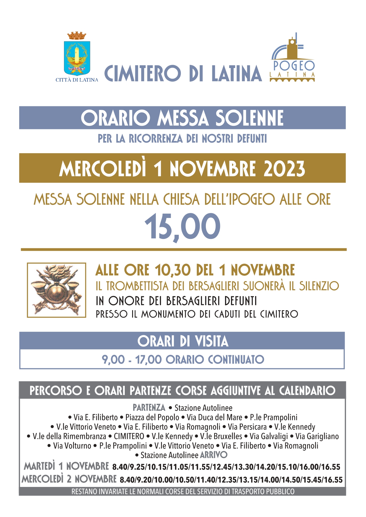 In occasione del Giorno di tutti i Santi e del Giorno della Commemorazione dei Defunti, il gestore del cimitero comunale ha disposto orari di apertura dedicati, prevedendo per domani alle ore 15 la celebrazione della messa solenne ufficiata dal Vescovo Mariano Crociata e da tutti i parroci della città, con circa 300 posti a sedere per i fedeli. Sarà possibile fare visita ai propri cari dalle ore 9 alle ore 17. Alle 10.30 del primo novembre, inoltre, il trombettista dei bersaglieri suonerà il silenzio, in onore dei bersaglieri defunti, presso il monumento dei caduti del cimitero. All’interno, inoltre, saranno attivati due “punti informazione” per agevolare l’utenza nella ricerca dei propri defunti nonché il servizio “assistenza ai visitatori” con personale riconoscibile da un’apposita pettorina con il compito di fornire informazioni, aiutare le persone anziane nelle operazioni di cambio dei fiori o accompagnare alle rispettive sepolture coloro che non riescono a individuarle.