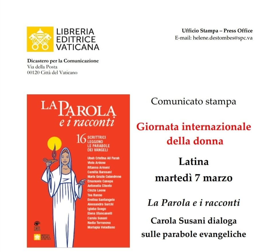 Nella ricorrenza, dell’8 marzo, Giornata internazionale della donna, la Libreria Editrice Vaticana organizza un evento pubblico a Latina il 7 marzo alle ore 17 a Latina in Curia Vescovile, intorno ai temi del libro “La Parola e i racconti” di Carola Susani.
