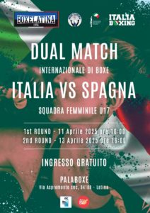 L’11 e il 13 aprile il PalaBoxe di via Aspromonte ospiterà il Dual Match tra la Nazionale femminile Under 17 italiana e la selezione spagnola. L’appuntamento internazionale, con ingresso gratuito e inizio alle ore 16, vedrà sul ring otto azzurrine, tra cui anche Aurora Turrin della Boxe Latina, che combatterà nella categoria 52 kg contro Andrea Buelga Garcia.