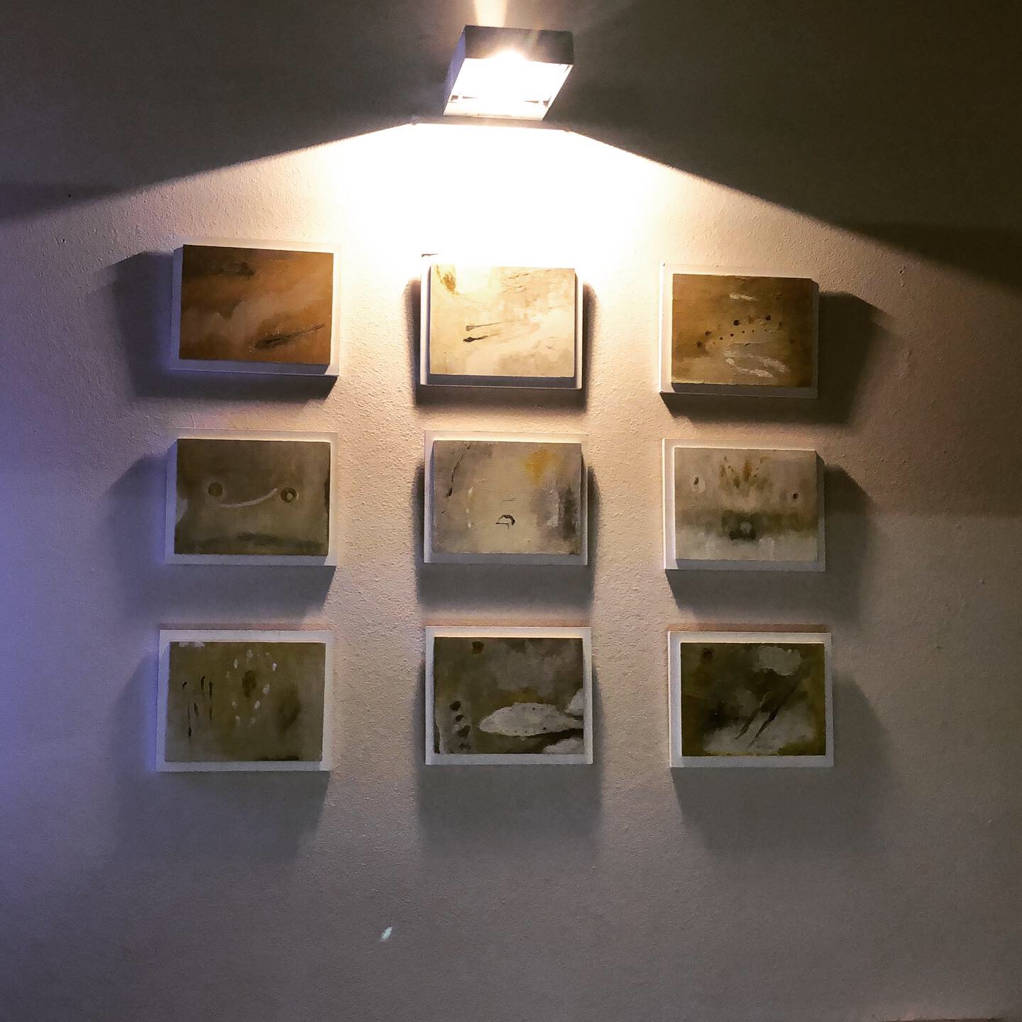 Sono piccole opere singole, monotipi che in forma collettiva esprimono stati d’animo e sensazioni dell’artista che ha di-segnato nella ristretta area del supporto ligneo proprio alla ricerca di uno spazio temporaneo dove esprimere frammenti di visioni minimali ma non per questo per forza sintetiche e meno intense. Questi puzzle segnici se ricomposti diventano una costellazione quindi un insieme di corpi a se stanti che popolano uno spazio di significato. Ognuno di essi già da solo ha tutte le informazioni per essere un piccolo mondo inconscio raccontato con uno “scatto” mentale dall’artista. Insieme, questi mondi si moltiplicano come i significati di ognuno; si possono invertire e sostituire per cercare un nuovo senso. I colori, sabbiosi e neutri assecondano la molteplicità di passaggi cromatici che fluiscono anche da toni caldi a freddi, le sottili incisioni, veri e propri graffi, si alternano a bruciature e colature di inchiostro acrilico.
