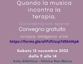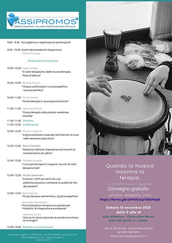 Si svolgerà sabato 12 novembre, presso l’Aula didattica della Clinica San Marco in viale XXI Aprile 2 a Latina, si terrà il convegno “Quando la musica incontra la terapia. Considerazioni sparse”, promosso da Assipromos Associazione Italiana Promozione Sociale, in collaborazione con PMTR Scienze delle terapie relazionali e Conservatorio di Latina Ottorino Respighi.