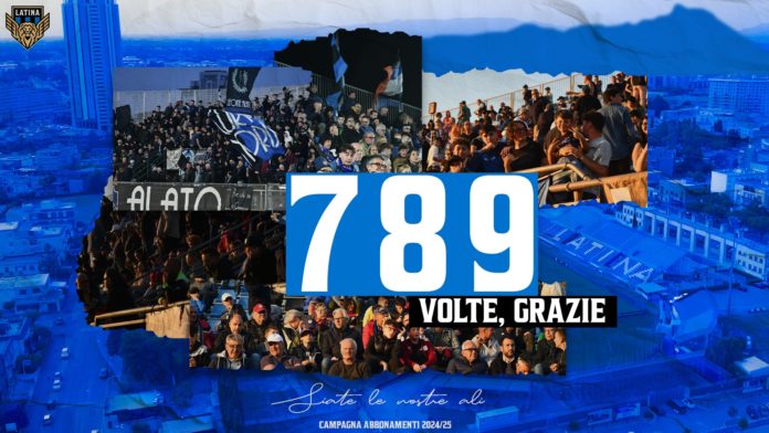 789 tessere sottoscritte per la campagna abbonamenti della stagione 2024/25 del Latina Calcio 1932. Sono 338 gli abbonamenti in più rispetto ai 451 della passata stagione. Un risultato che ci rende orgogliosi e che testimonia la crescente passione e il rinnovato entusiasmo attorno al nostro progetto sportivo.