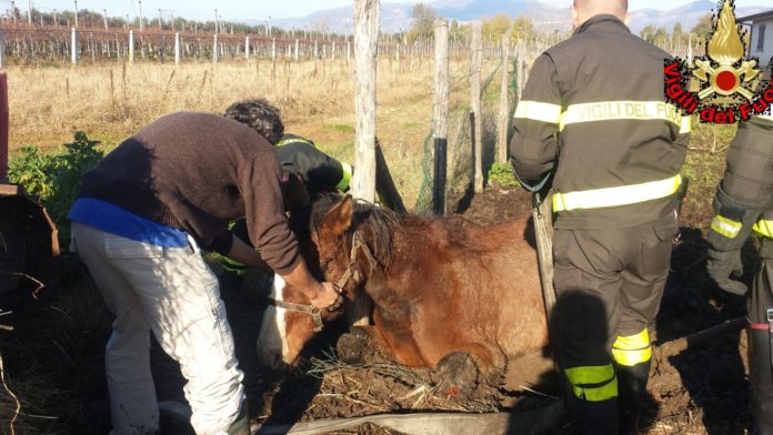 Era scivolata sul fango e non riusciva più a tirarsi su e allora ci hanno pensato i vigili del fuoco con una gru. Protagonista della disavventura una cavalla di 500 chili che nella tarda mattinata di oggi se l’è vista brutta in un terreno di via Uccellara. Sul posto è intervenuta la squadra 1 A dei vigili del fuoco con un’autogru. I vigili del fuoco hanno dovuto lavorare non poco per rimettere in piedi l’animale. Ma alla fine, dopo un’ora di tentativi, ce l’hanno fatta.