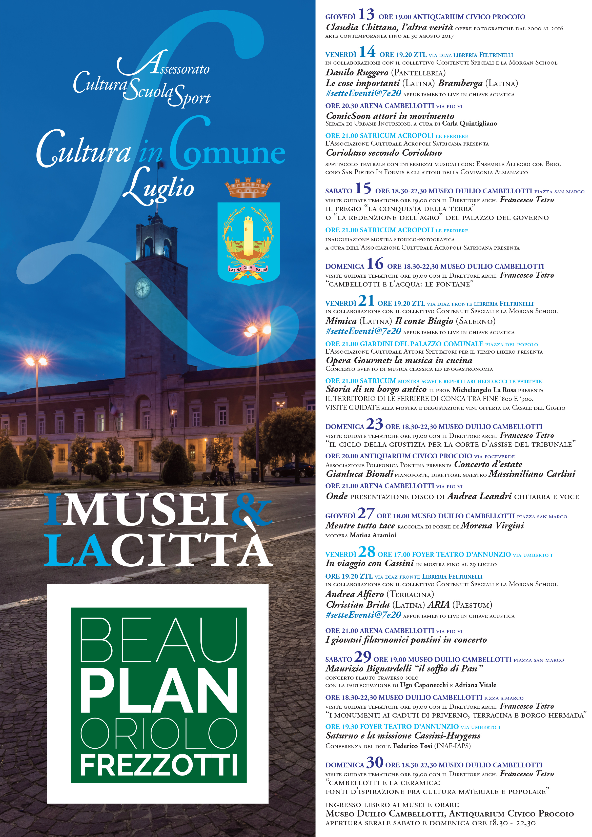 Aperture straordinarie di musei e siti culturali, spettacoli di musica e teatro, mostre di libri e approfondimenti, sono tante le proposte contenute nel programma di eventi presentato oggi dall’assessorato alla cultura del Comune di Latina che parte questa sera e andrà avanti per tutto il mese di luglio.
