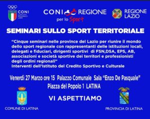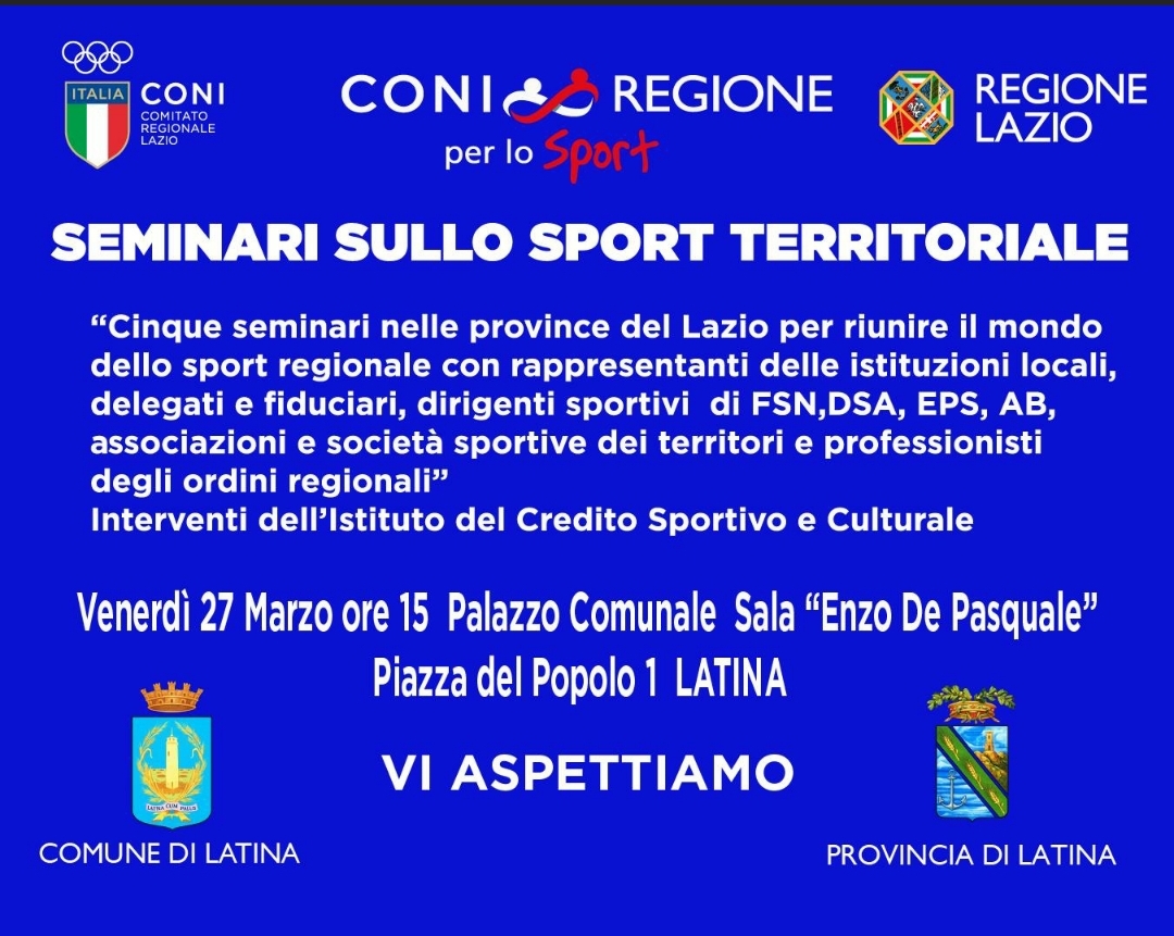 Da oggi fino a domenica 29 marzo la città di Latina apre la prima edizione di “Let’s Move Together”, l’evento promosso dall’Associazione EPS Lazio con il contributo della Regione Lazio e il sostegno del CONI Lazio, che porterà lo sport di base nelle piazze, nelle strade e nei palazzetti delle cinque province della regione. La tre giorni è stata aperta oggi da un seminario pubblico organizzato dal CONI Lazio nella Sala De Pasquale del Comune di Latina, dedicato allo sport territoriale e all’impiantistica sportiva. L’incontro, inserito nel protocollo di collaborazione tra CONI e Regione Lazio, ha visto la partecipazione di dirigenti, tecnici e rappresentanti delle istituzioni locali, dando il via ufficiale all’iniziativa.