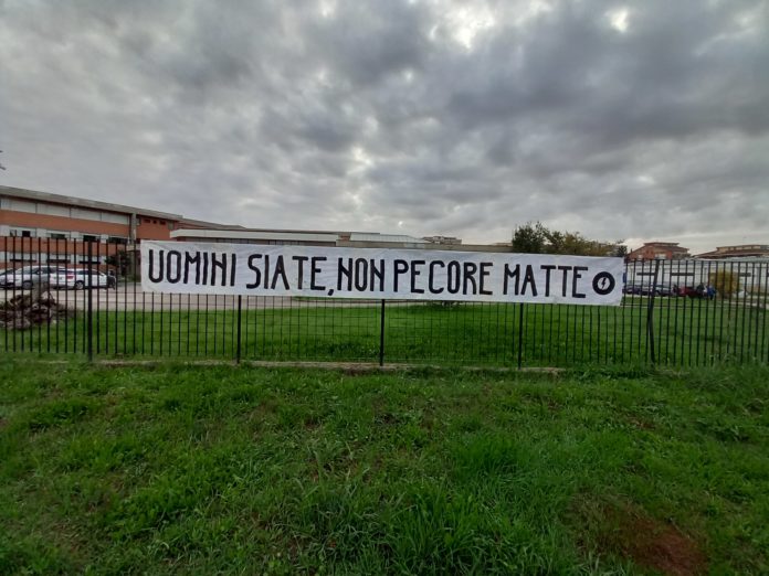 “Uomini siate e non pecore matte”: questa la frase presente sullo striscione che i militanti del blocco studentesco Latina hanno affisso davanti all'”IIS Marconi”.