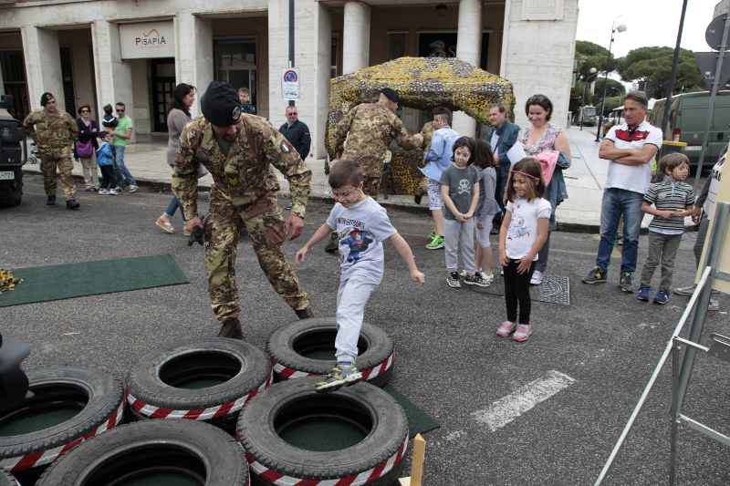 I militari della Caserma “Santa Barbara” hanno allestito, all’ombra del Palazzo del Governo, una “mostra statica” con gli equipaggiamenti in dotazione alla specialità Controaerei dell’Esercito Italiano, tra cui un battello utilizzato per l’addestramento anfibio, un sistema d’arma controaerei spalleggiabile “Stinger” ed un lanciatore “SAMP/T”. Molti i cittadini interessati che hanno potuto conoscere le varie peculiarità dei materiali e sistemi grazie al personale dei reparti stanziati a Sabaudia. I più piccoli sono stati particolarmente incuriositi dal “Circuito Addestrativo Militare” preparato dai militari del 17° Reggimento “SFORZESCA” a misura di bambino. I bimbi, accompagnati dagli uomini in uniforme, hanno saltato ostacoli, superato muretti, strisciato sotto barriere, mantenuto l’equilibrio sulle panche oscillanti e, una volta arrivati al traguardo, hanno lanciato una bomba (una palla colorata) contro il bersaglio. All’arrivo, i circa 200 ragazzi che si sono cimentati nel percorso, hanno ricevuto il simbolico attestato di “superamento della prova”, un ricordo tangibile della giornata passata insieme ai militari della “Santa Barbara”.