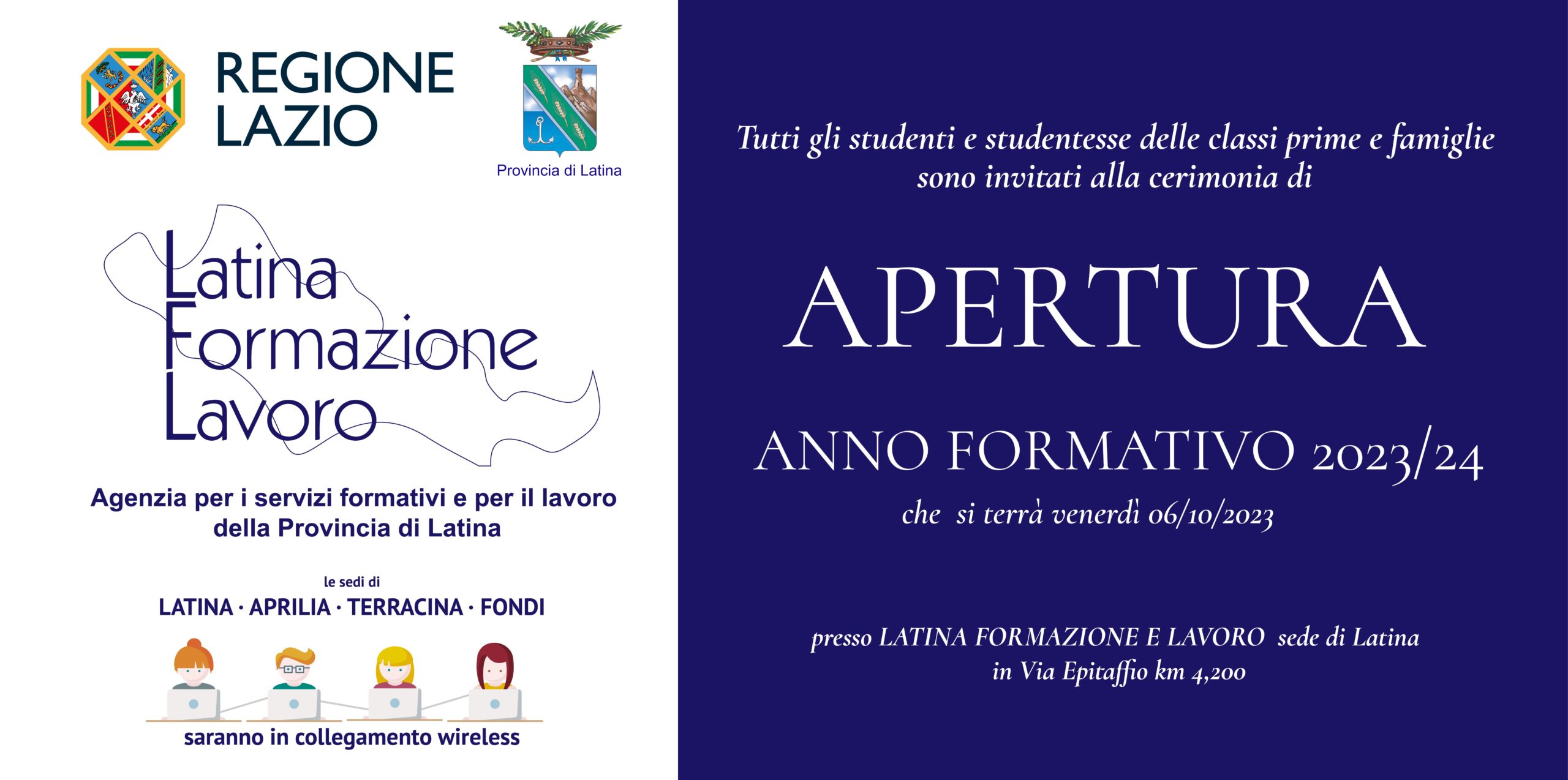 Un evento che punta a coinvolgere tutti gli allievi quello organizzato dalla Latina Formazione Lavoro, agenzia di servizi formativi della Provincia di Latina, per venerdì 6 ottobre a partire dalle ore 10 in occasione dell’apertura dell’anno formativo 2023/2024.