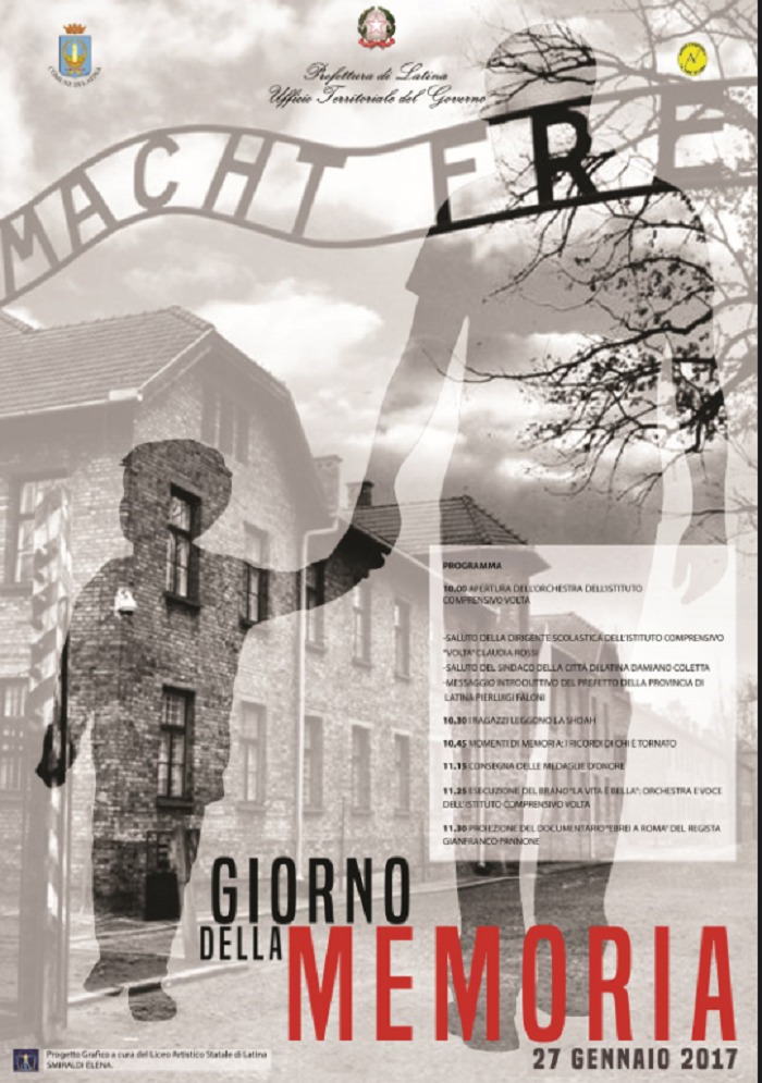 Si svolge domani, 27 gennaio, alle 10, presso il teatro Ponchielli di Latina, la manifestazione per il Giorno della Memoria, organizzata dalla Prefettura di Latina, con la collaborazione dell’istituto comprensivo Volta, del liceo Artistico, dell’ufficio scolastico Provinciale e dell’amministrazione Comunale.