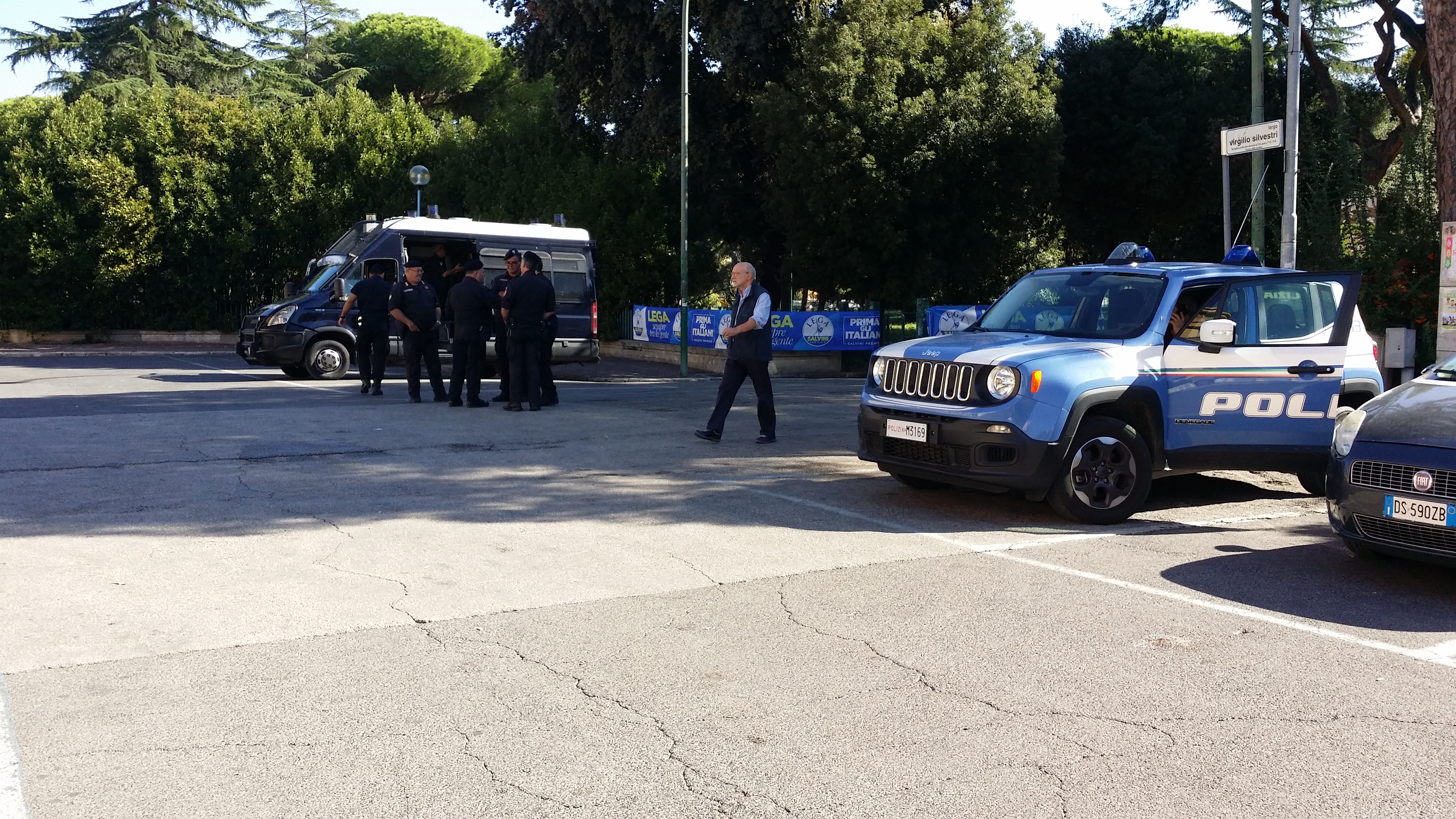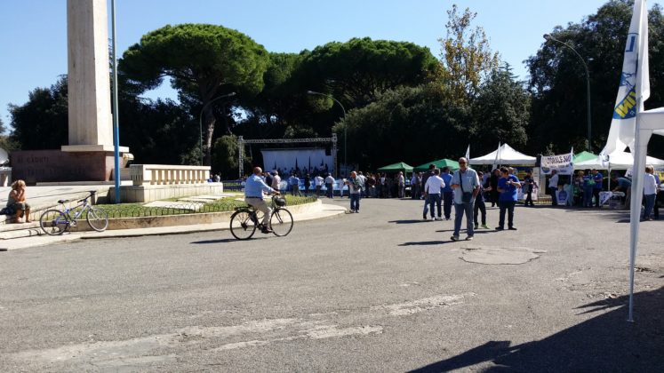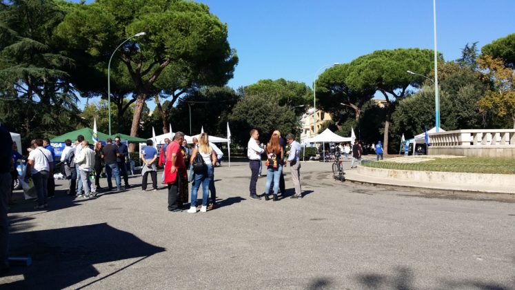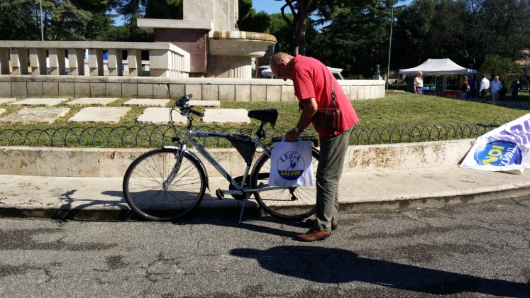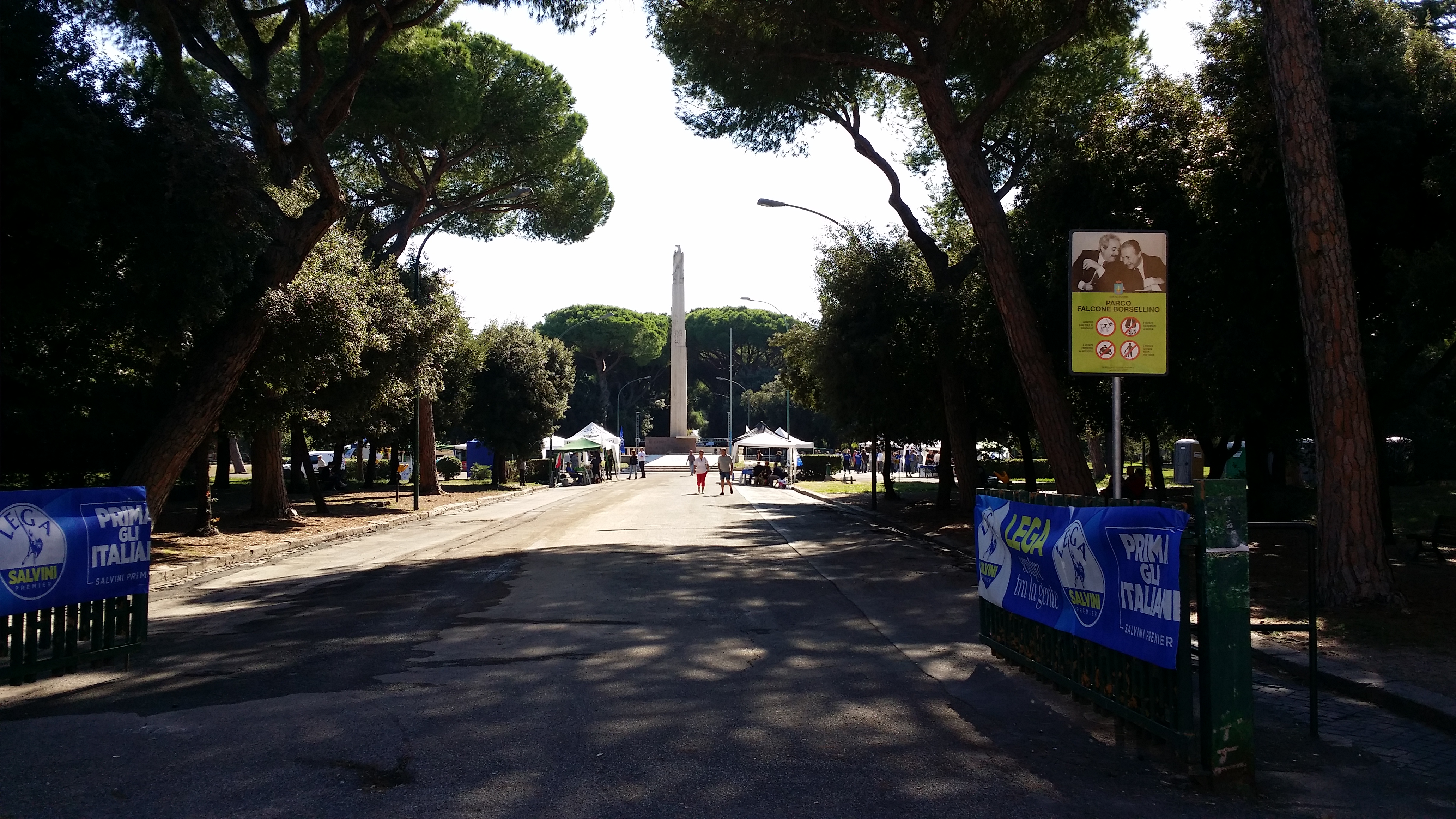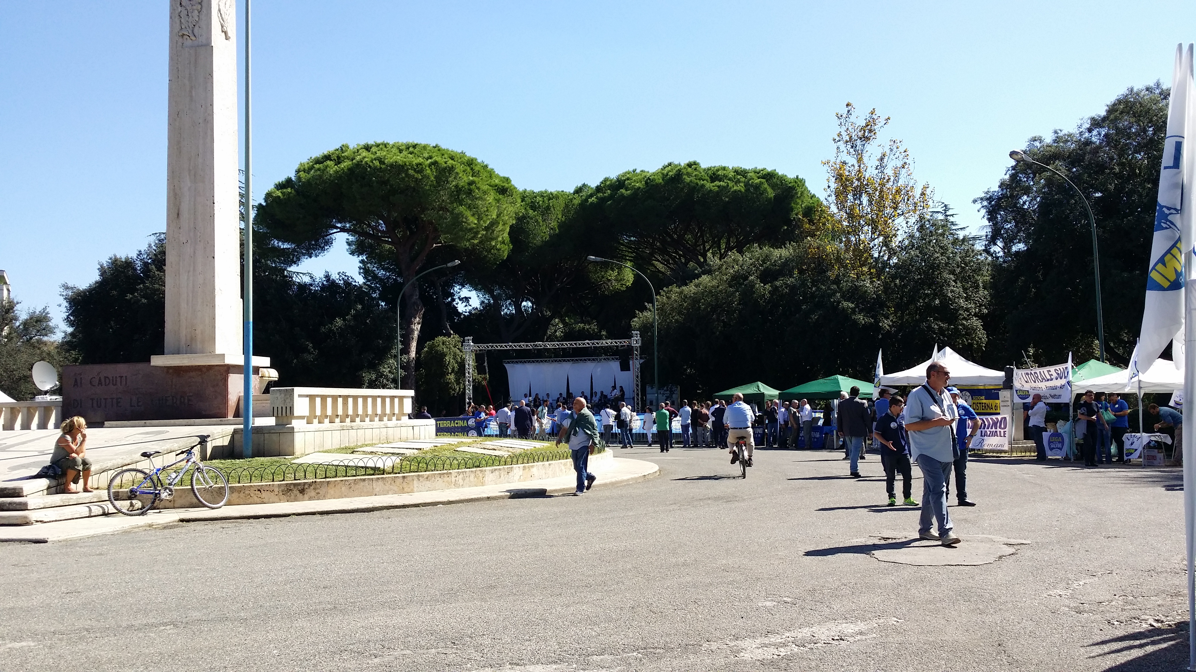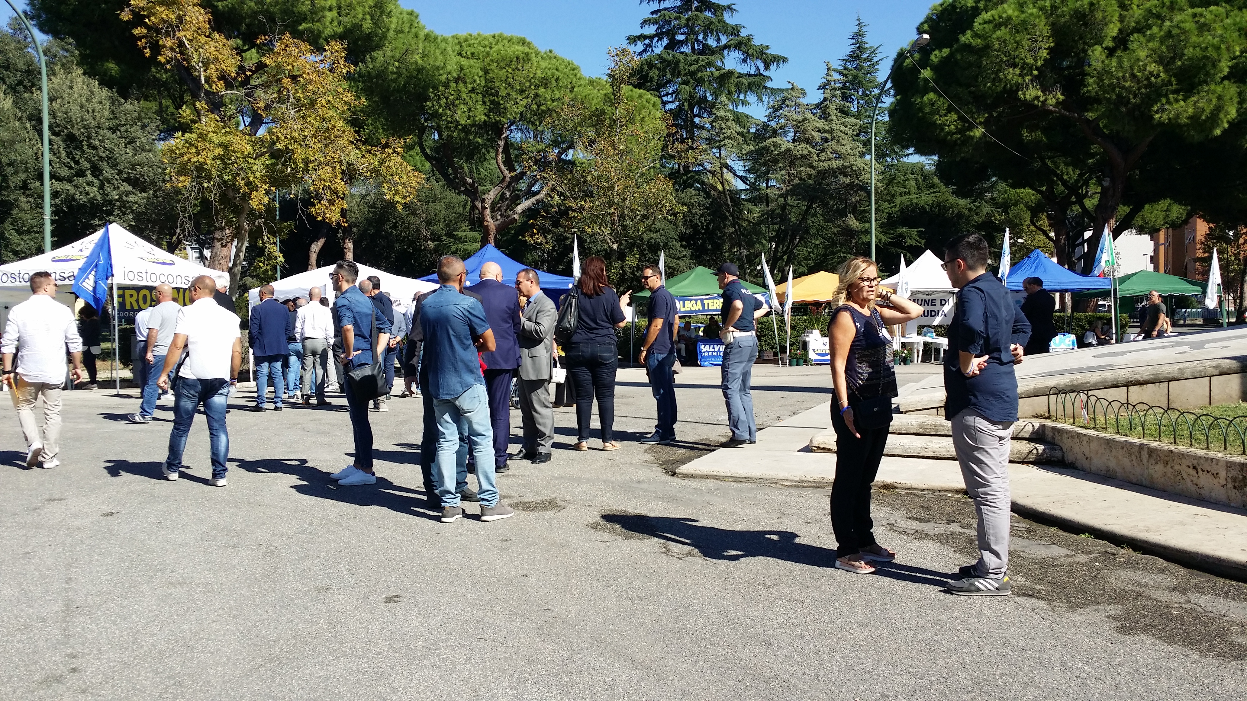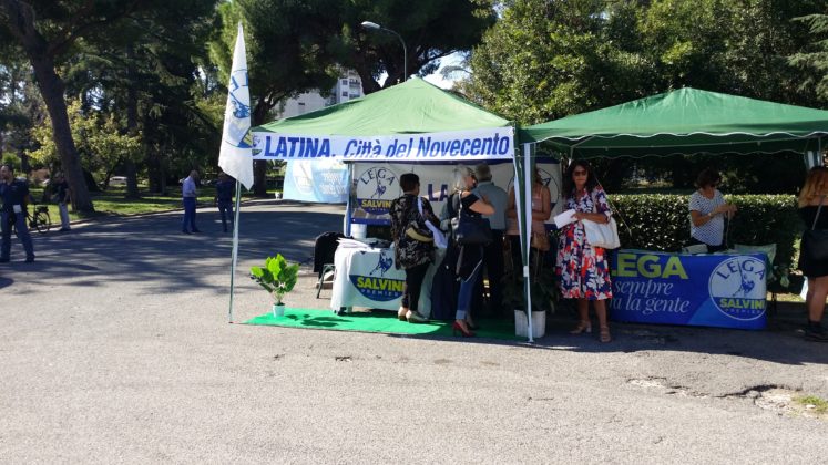Il cielo è limpidissimo e il sole di queste strane stagioni non perdona neanche in questo sabato di fine settembre e spinge la gente che inizia ad arrivare, poco prima delle 11, a ripararsi sotto i gazebo e gli alberi che circondano lo slargo del monumento ai caduti. All’esterno del Parco Falcone-Borsellino, in pieno centro storico di Latina, i divieti di sosta temporanei e le strade transennate annunciano l’evento della giornata: la festa regionale della Lega con tanto di partecipazione del vice-premier Matteo Salvini. Il ministro dell’Interno è atteso ai giardinetti alle 19.30 (è prevista la diretta tv su Canale 68), dopo l’incontro con il prefetto di Latina Maria Rosa Trio al palazzo del Governo della vicina piazza della Libertà.