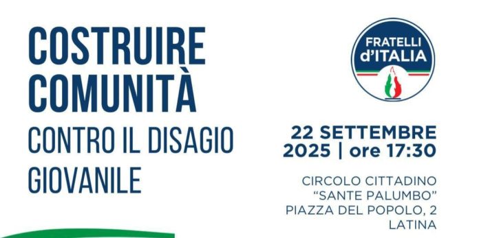 A Latina, lunedì prossimo, 22 settembre, si terrà presso il Circolo cittadino “Sante Palumbo”, un convegno pubblico, organizzato dalla Federazione provinciale di Fratelli d’Italia, dal titolo “Costruire comunità contro il disagio giovanile”. Argomento così attuale, viste le vicende degli ultimi giorni, che hanno segnato il territorio pontino.