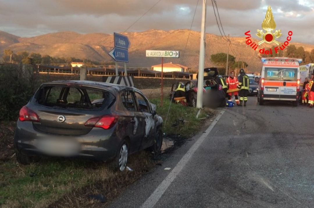 Incidente stradale oggi pomeriggio alle porte di Latina: due i mezzi coinvolti, uno dei quali ha preso fuoco; tre le persone rimaste ferite. Il sinistro, la cui dinamica è al vaglio dei carabinieri, si è verificato nei pressi dell’incrocio tra la Migliara 41 e via Trasversale. Sul posto sono prontamente intervenuti i vigili del fuoco che hanno provveduto a spegnere l’incendio e ad estrarre dalle lamiere i due occupanti dell’altra vettura. I due e la persona al volante dell’auto a fuoco sono stati soccorsi dal personale del servizio 118.