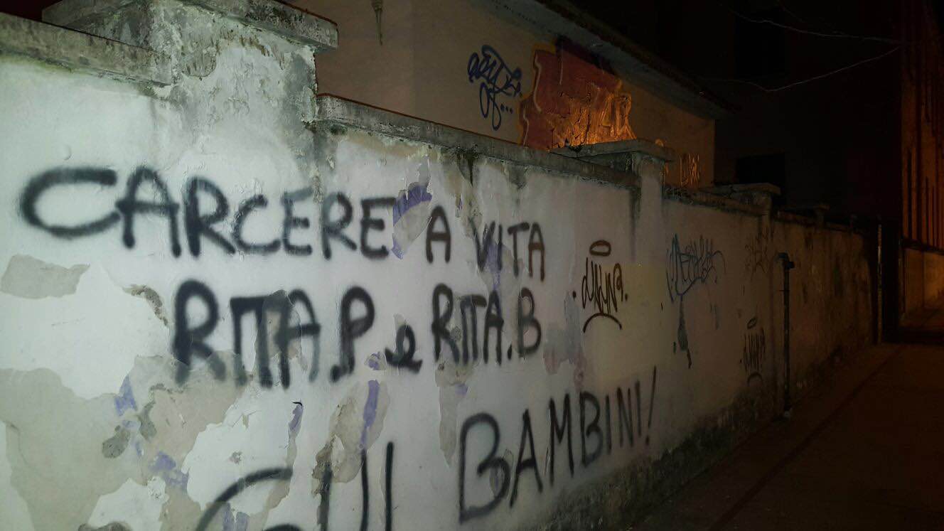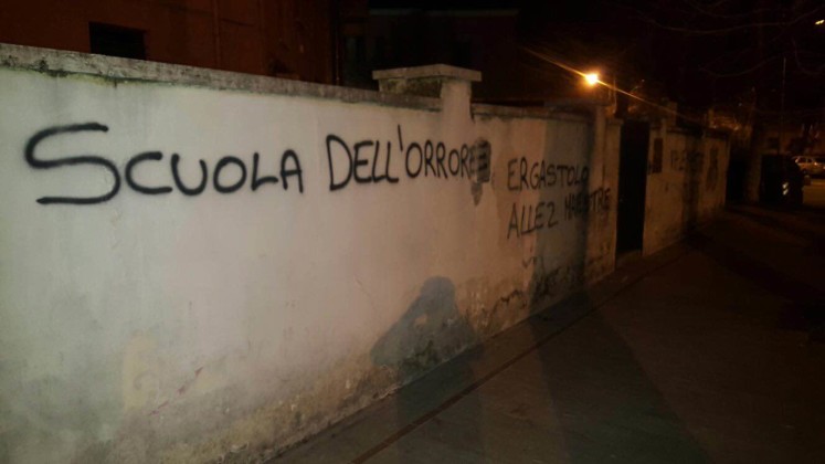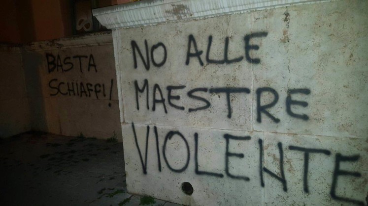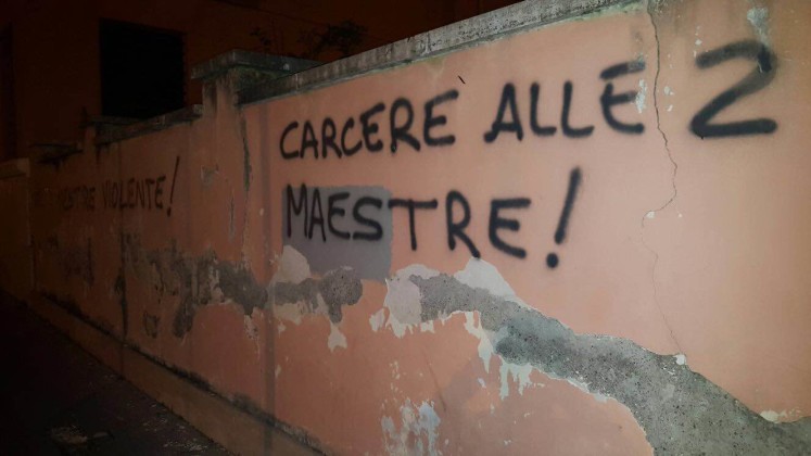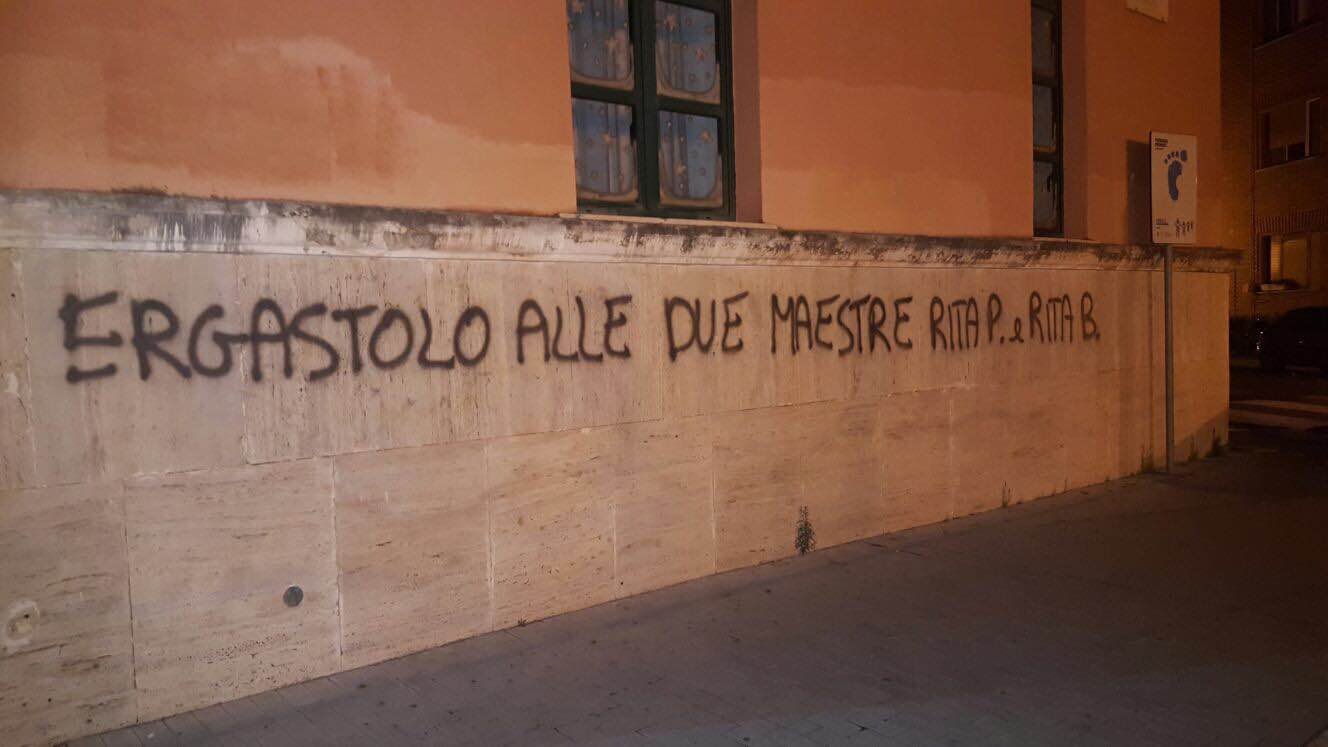 La reputazione della scuola rovinata in un colpo solo. La città intera che parla di vergogna da cancellare. Il caso delle due maestre sospese dal servizio per un anno dopo l’indagine della polizia che ha portato a scoprire i loro metodi violenti nelle aule della scuola dell’infanzia di piazza Dante, ha scatenato reazioni forti a Latina, tra i genitori e il corpo docente, soprattutto, ma anche attraverso i social network. Una rabbia esplosa nel pomeriggio di oggi anche attraverso gesti inopportuni, come quelli della mano ignota che a colpi di bombolette spray ha lanciato strali pesantissimi sui muri della scuola, nella parte retrostante. “Carcere alle due maestre”, “No alle maestre violente”, “Scuola dell’orrore” sono sole alcune delle frasi che campeggiano sui muri, tra via Fratelli Bandiera e via Fabio Filzi.