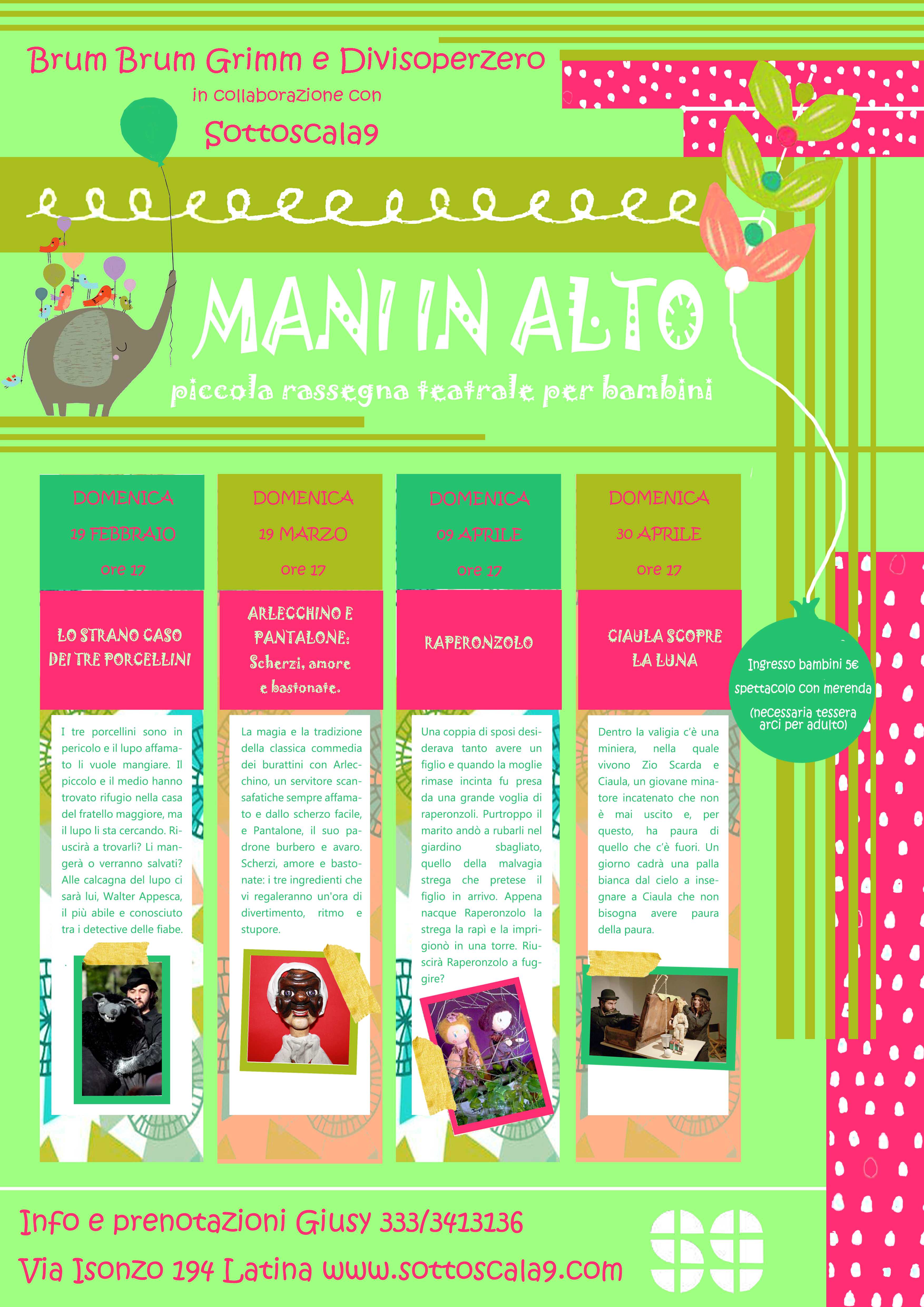 “Mani in alto” chiuderà il 30 aprile con l’ultimo show “Cappuccetto Rosshow”. Tutti gli spettacoli vanno in scena di domenica alle 17 e durano circa 45 minuti. Il prezzo di ingresso per i bambini è di 5 euro (merenda compresa), per gli adulti invece è richiesta soltanto la tessera Arci, che si può sottoscrivere nel locale. Per ulteriori informazioni e prenotazione è possibile chiamare il 333/3413136. In alternativa si possono visitare il sito web www.sottoscala9.com oppure la pagina Facebook dell’evento: https://www.facebook.com/events/1819180905014367/. I clienti possono parcheggiare l’auto lungo via G. A. Sartorio (dall’altra parte di via Isonzo rispetto al Sottoscala9).