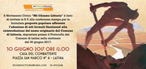 E’ fissata per venerdì 30 giugno, alle 12, presso la sala conferenze della “Casa del Combattente”, in piazza San Marco a Latina, l’assemblea pubblica aperta a tutta la cittadinanza promossa dal Movimento civico “Mi chiamo Littoria”, durante la quale sarà presentata ai cittadini e alle istituzioni locali la proposta popolare, che nella stessa giornata sarà depositata presso il Protocollo del Comune di Latina e che riguarda “in via principale, l’adozione di atti formali finalizzati alla reintroduzione del nome originario del Comune di Littoria e, in via subordinata, la equiparazione giuridica, formale e sostanziale, del nome originario del Comune di Littoria a quello di Latina. La proposta, inoltre, prevede che, in corrispondenza delle due giornate storiche (30 Giugno 1932 posa della prima pietra e data di fondazione della città e 18 Dicembre 1932 data di inaugurazione della stessa) la città assuma il nome originario di Littoria”.