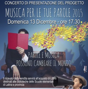 “Con questo progetto – spiega il Maestro Stefania Cimino – abbiamo voluto creare un ponte, senza confini di età, tra la lettura e la musica arricchendo il patrimonio culturale di Latina e provincia ma soprattutto cercando di dare un contributo concreto alle nostre scuole, ed in particolare ai più piccoli, che iniziano ad approcciarsi alla lettura e alla musica. Un modo per sentirci, e far sentire tutti, parte – conclude Stefania Cimino – di una sola grande realtà che per crescere ha bisogno del coinvolgimento e del contributo di tutti. Oggi la musica non è solo note ma è progettualità, interazione con l’arte, con la letteratura, con la società. Quando leggiamo un libro, una frase, una poesia in noi nasce un mondo fatto di immagini, profumi, colori e suoni. Questi valori, questi principi e queste caratteristiche le abbiamo, sperando di esserci riusciti, nelle 11 tracce dove gli unici protagonisti sono non solo le eccellenze della nostra città ma anche e soprattutto la fantasia e la sensibilità di ciascuno”.paroleemusica13dicembre