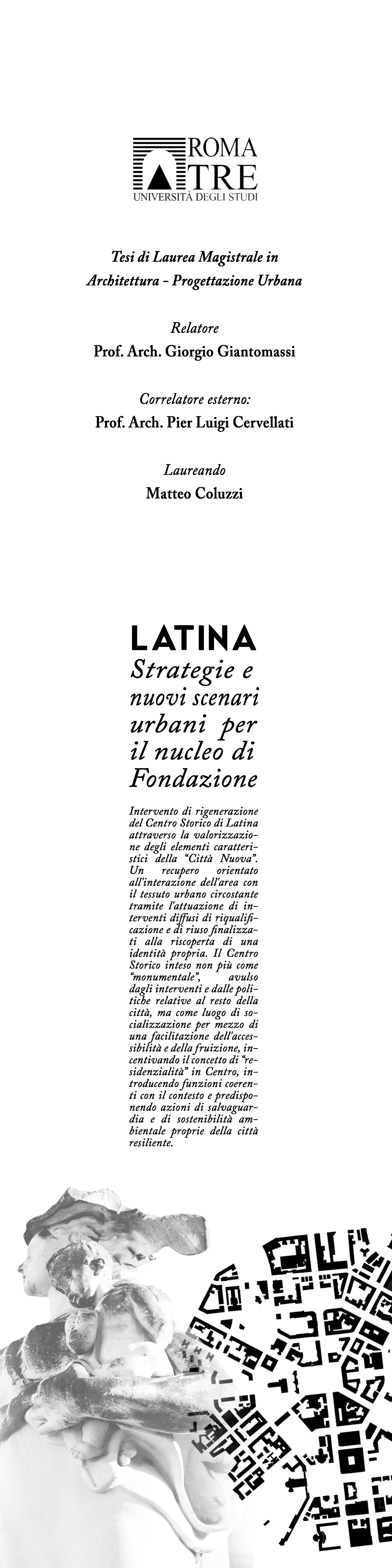 L’immagine in basso ritrae la copertina della tesi di laurea di Matteo Coluzzi, conseguita pochi giorni fa presso l’università RomaTre in Architettura e progettazione urbana. La “notizia” è arrivata ieri a Latina nel corso dell’assise civica per l’approvazione del bilancio. Come mai? Intanto perché Matteo Coluzzi è consigliere comunale e poi perché il titolo è dedicato al capoluogo pontino: “Latina: strategie e nuovi scenari urbani per il nucleo di fondazione”. Ma c’è anche un terzo motivo, sottolineato dal consigliere leghista Matteo Adinolfi, che sta nel nome del correlatore della tesi: Pier Luigi Cervellati. All’esponente di destra, ex assessore al bilancio della giunta di Ajmone Finestra, non poteva sfuggire il dettaglio. E altro che dettaglio! Il professor Cervellati vale a Latina un pezzo di storia, la storia di un nuovo Piano regolatore generale adottato proprio durante l’era Finestra e mai approvato.