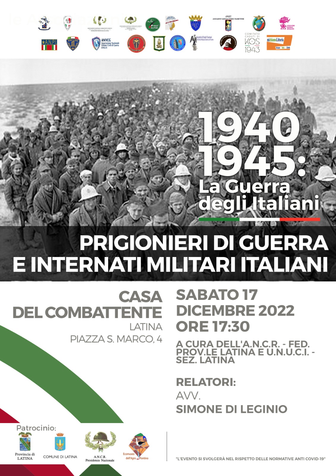 Si terrà oggi, 17 Dicembre 2022, dalle ore 17:30, presso il plesso “Casa del Combattente” (Piazza San Marco n. 4 – Latina) la conferenza tematica “Prigionieri di Guerra e Internati Militari Italiani”, a cura dell’Associazione Nazionale Combattenti e Reduci – Federazione Provinciale di Latina e Sezione di Latina.