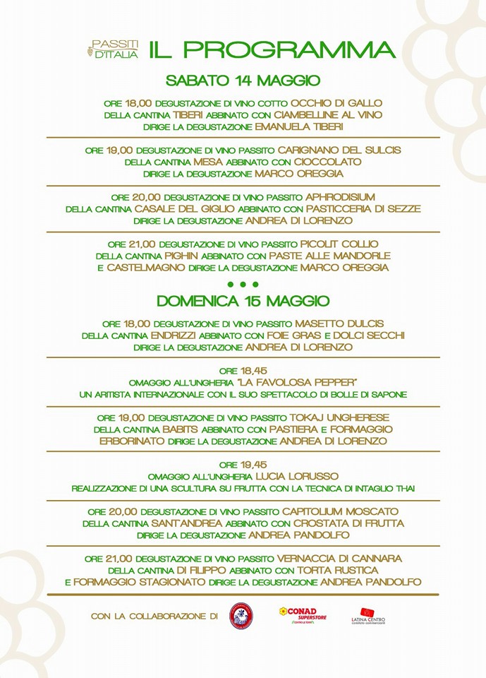 Sabato 14 e domenica 15 maggio, dalle 16 alle 23, si svolge presso il Palazzo M a Latina, la seconda edizione di “Passiti d’Italia”, organizzata dall’associazione Smart, dalla Fisar Latina Sommelier, in collaborazione con Conad Superstore e l’associazione Commercianti Latina Centro.