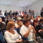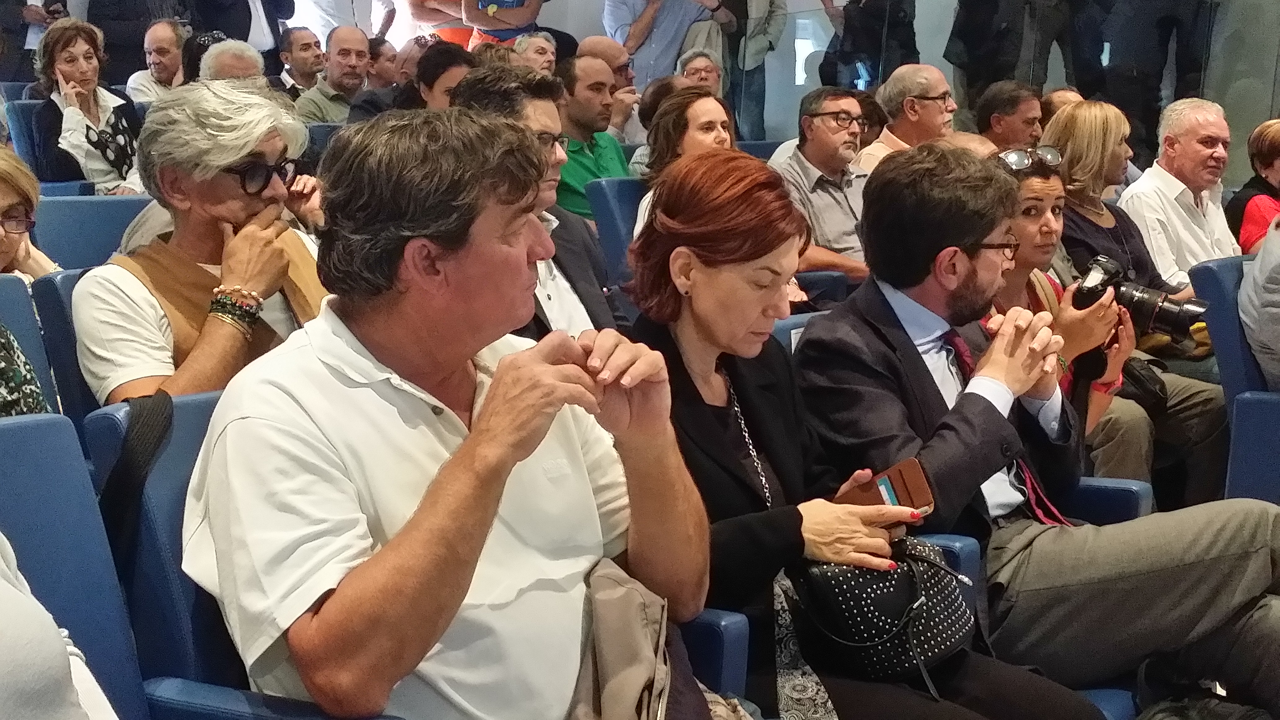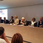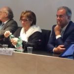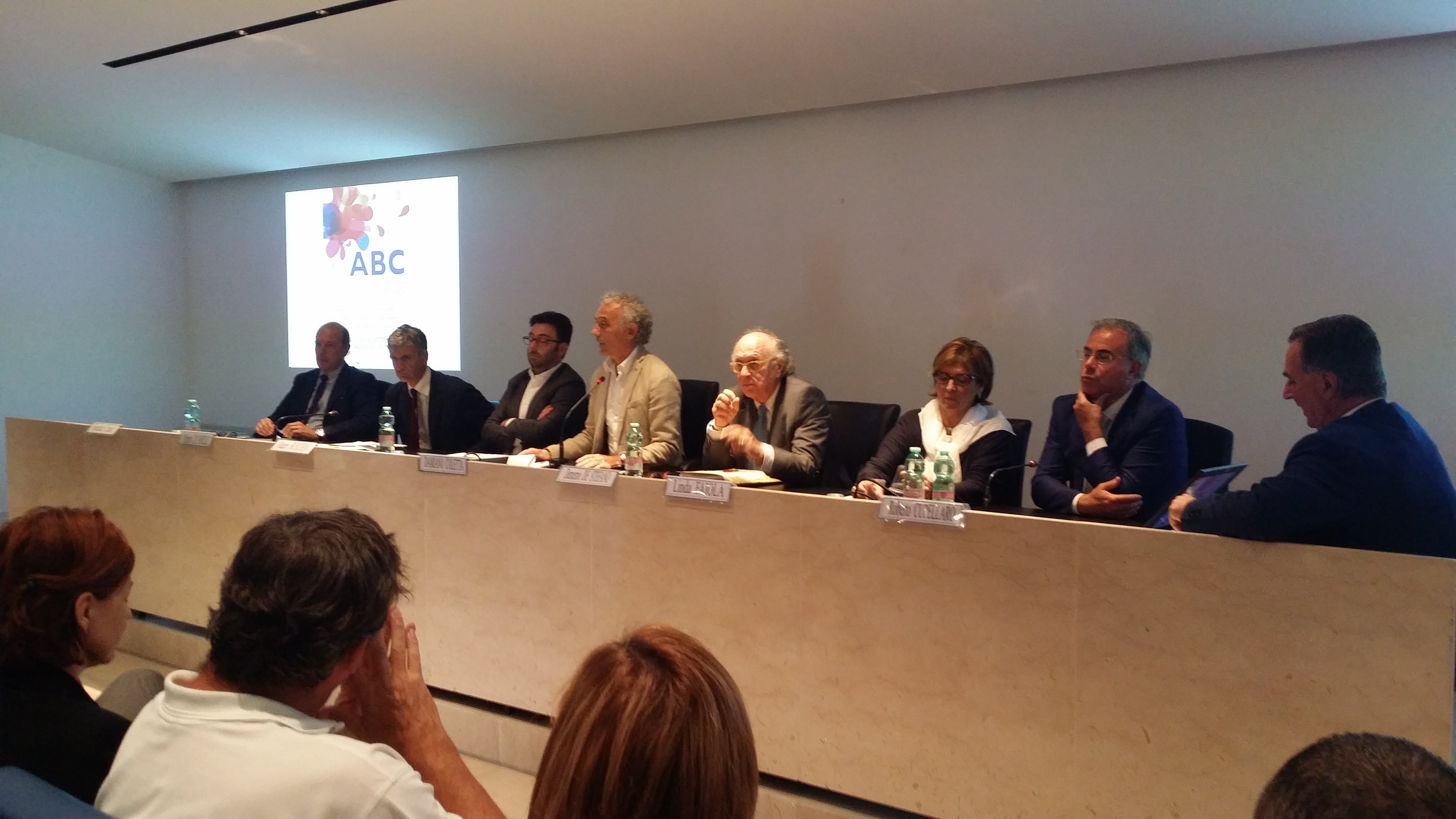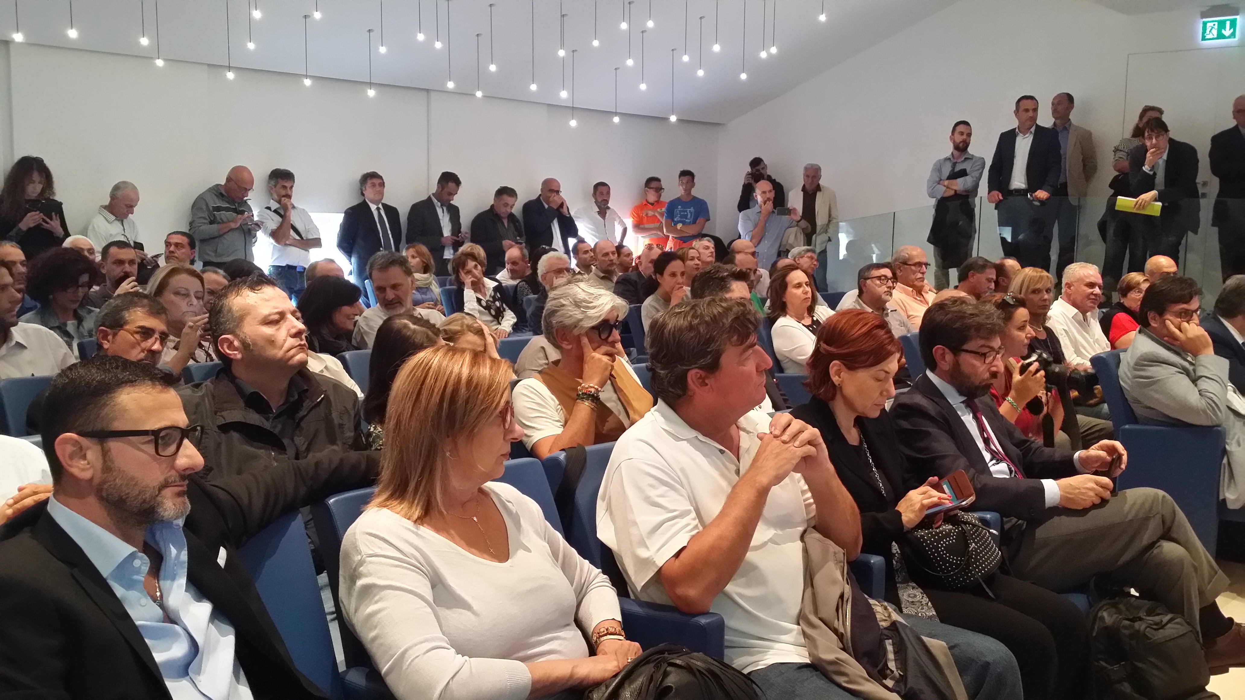 Il tavolo dell'incontro pubblico per la presentazione dell'Abc. Da sinistra: Gianluca Cencia, amministratore unico di Codice Ambiente, il professor Alberto Lucarelli progettista Abc, l'assessore regionale all'ambiente Mauro Buschini, il sindaco di Latina Damiano Coletta, il presidente del cda dell'azienda speciale Demetrio De Stefano, Linda Faiola e Roberto Cupellaro componenti del Cda