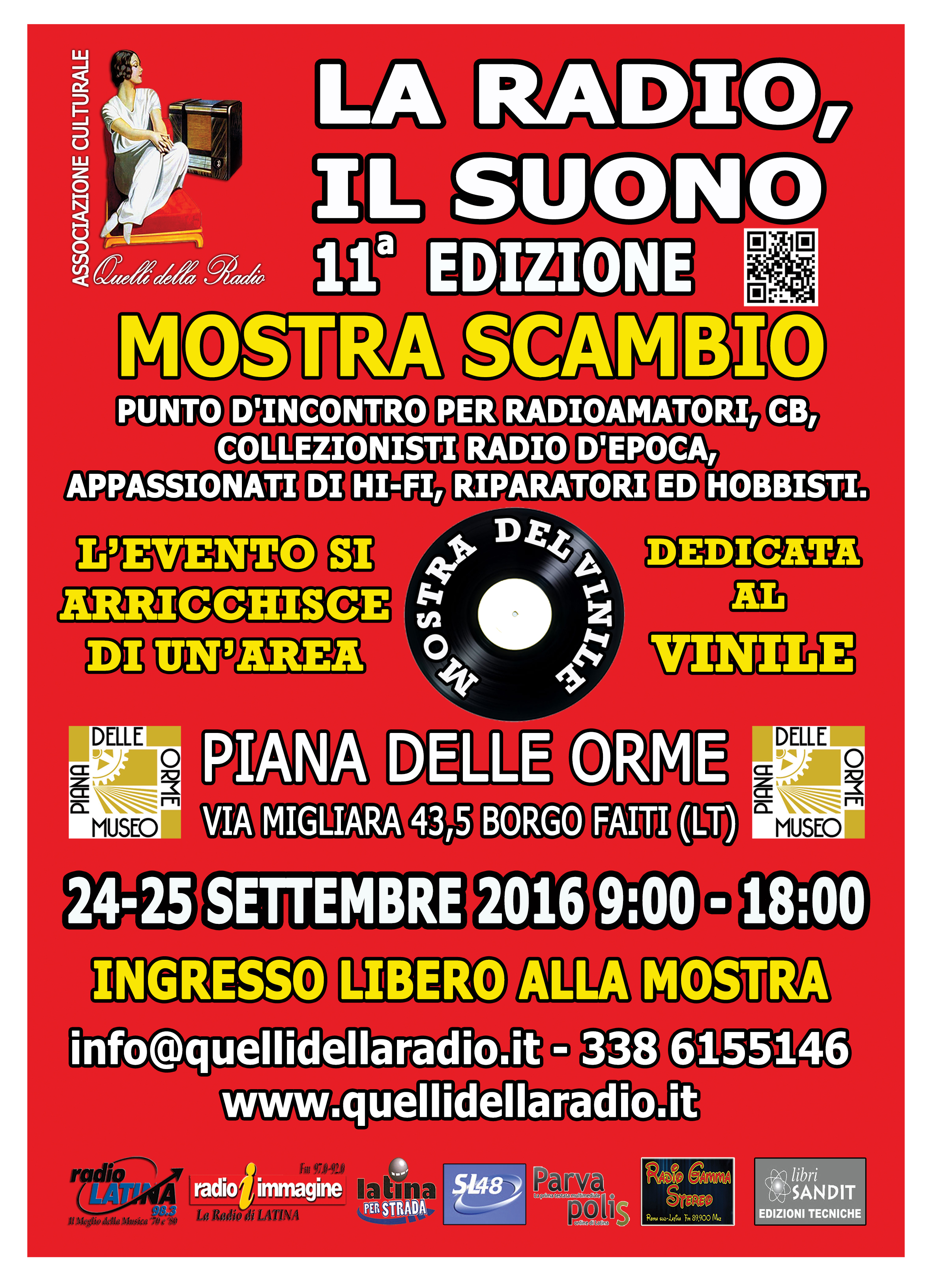 E’ tutto pronto per dare il via all’XI edizione di La radio, il suono, la manifestazione ad ingresso libero promossa dall’associazione Quelli della radio, che si svolge il 24 e il 25 settembre, presso il museo Piana delle Orme a Borgo Faiti, che come ogni anno contribuisce alla perfetta riuscita dell’appuntamento di grande richiamo ed interesse per la cittadinanza di Latina e provincia.
