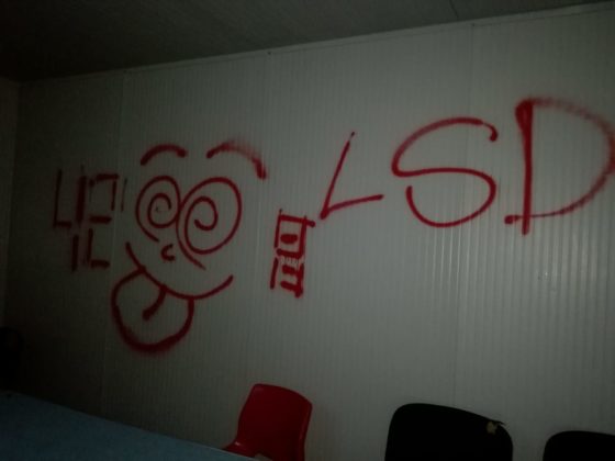 Sulle pareti dei container c’erano alcune scritte di colore rosso e verde. Insulti alla polizia: “Acab” (All cops are bastards, tutti i poliziotti sono bxxxx), e “Fuck police“, in inglese. Vicino alla parola Acab anche i numeri 1312, si tratta sempre della stessa parola scritta utilizzando il numero delle lettere nell’alfabeto (1 = A, 3 = C, 1 = A, 2 = B)