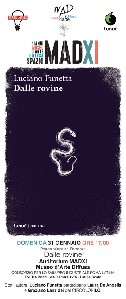 Il Circolo Filò organizza un incontro con Luciano Funetta, autore di “Dalle Rovine”, libro edito dalla Tunué. La presentazione del libro si terrà domenica 31 gennaio alle ore 17, nello spazio del Museo d’Arte Diffusa in via Carrara, nella zona Industriale di Tor Tre Ponti.