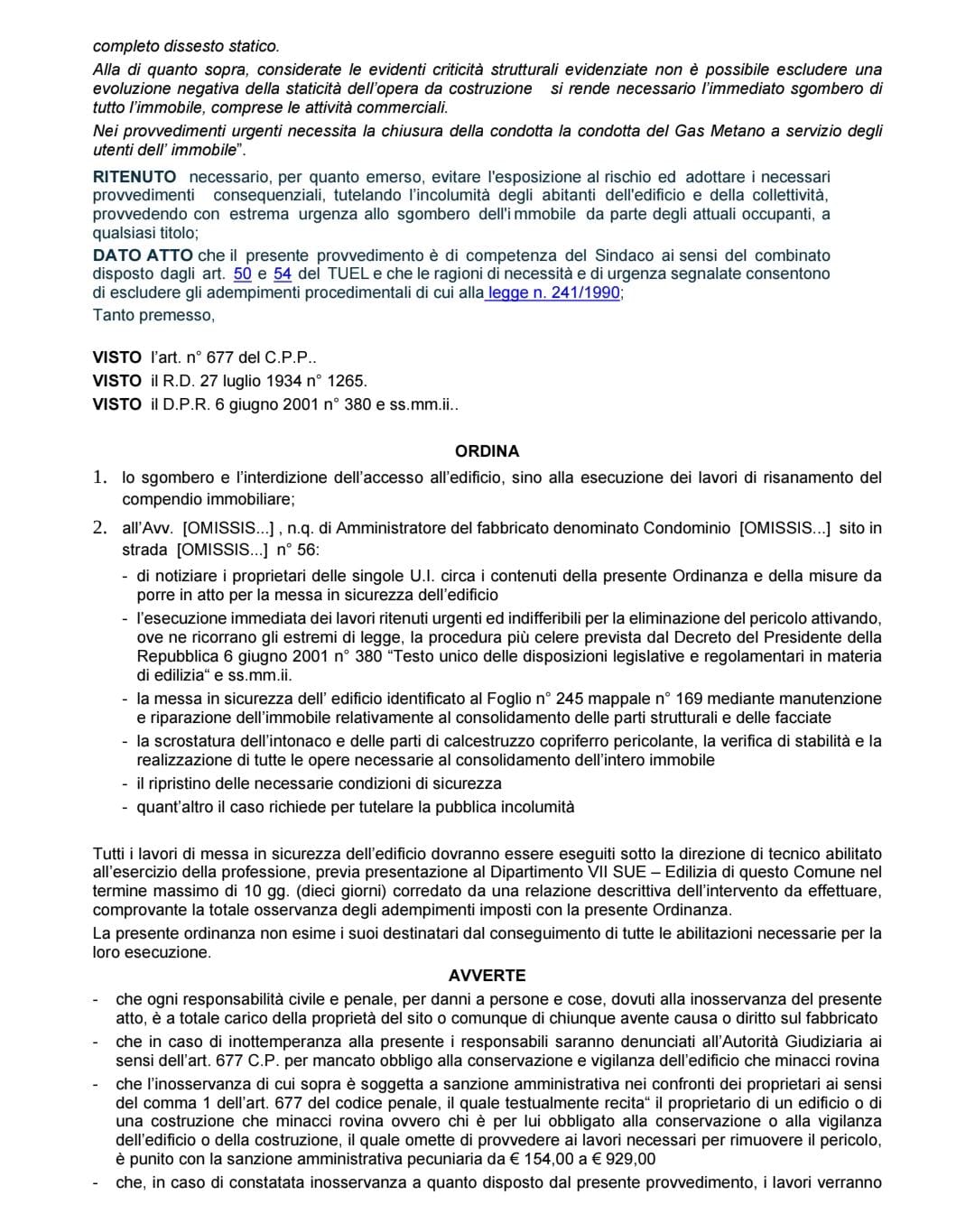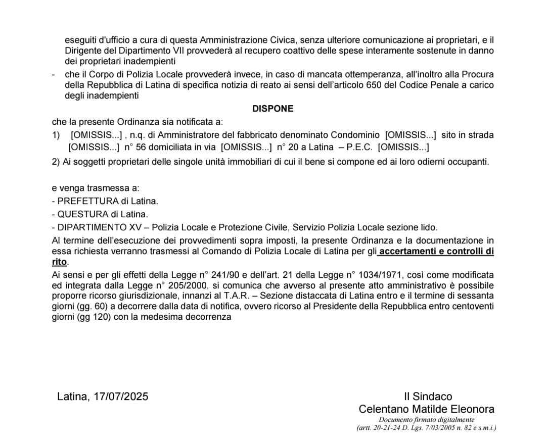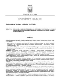 Il Comune di Latina ha emesso un’ordinanza di evacuazione di una palazzina a Foce Verde, Latina Lido, in strada Valmontorio, dopo che tecnici comunali, Vigili del Fuoco e Polizia Locale hanno riscontrato un grave deterioramento della struttura portante in cemento armato. Il sopralluogo, avvenuto ieri 17 luglio, ha evidenziato un pericolo immediato per chi vive e lavora nell’edificio.