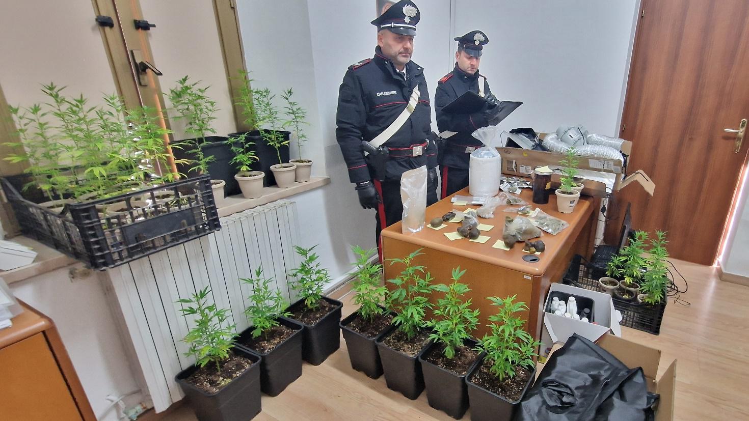 A seguito di un controllo presso la propria abitazione, il 39enne è stato trovato in possesso di 1,2 kg di hashish, 331gr di polvere di hashish, 834gr di olio di hashish, 182gr di marijuana e 45 piante di marijuana alte 40cm. Durante il controllo l’uomo brandendo un paio di forbici, ha minacciato il suicidio, ma è stato fermato prontamente dai militari senza nessuna conseguenza.