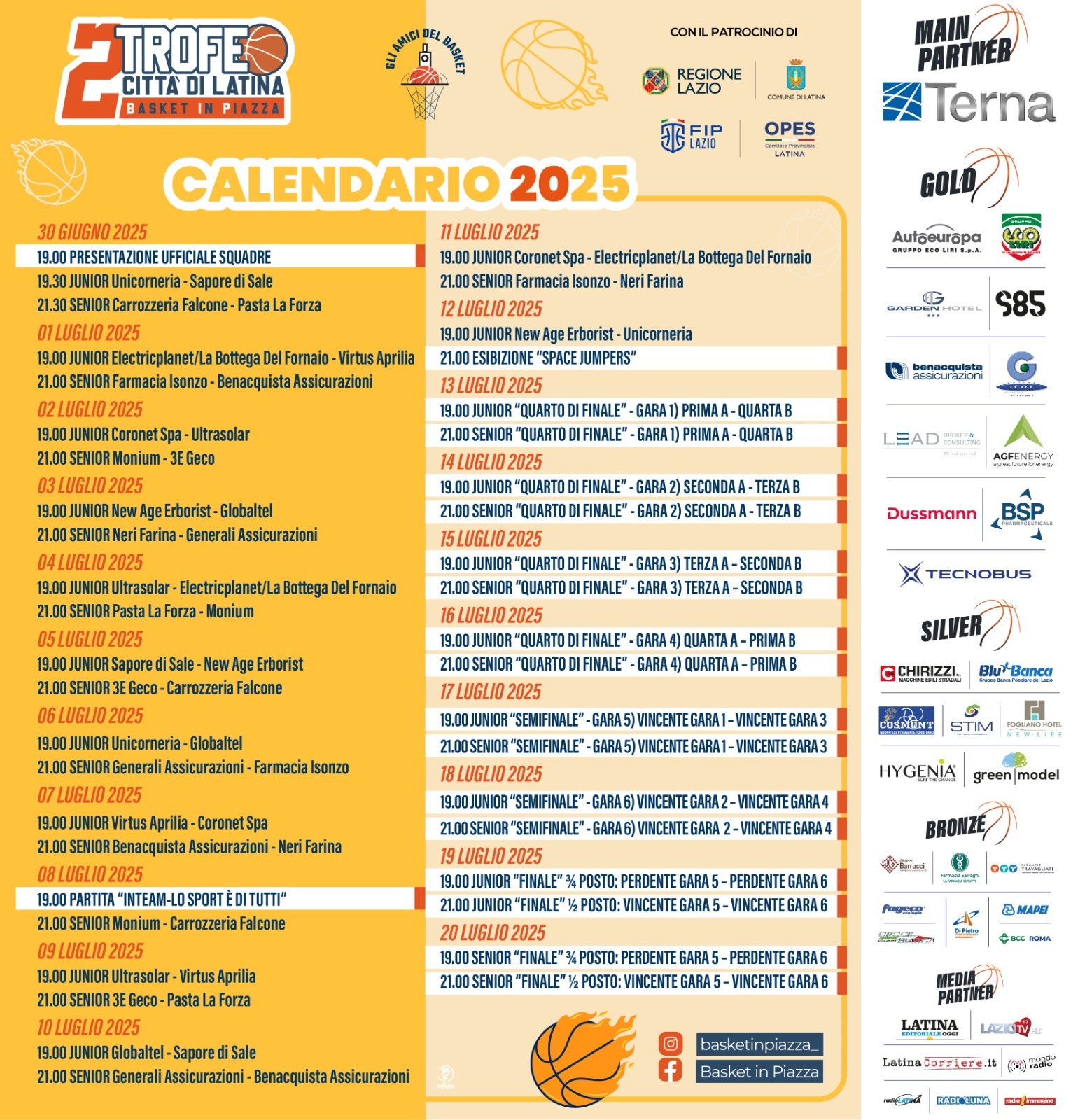 Il Trofeo Città di Latina, evento centrale della manifestazione, si giocherà dal 30 giugno al 20 luglio, con in campo le categorie Junior e Senior. Le gare inizieranno ogni sera alle 19 con i Junior e alle 21 con i Senior. La formula prevede una composizione mista, con almeno una giocatrice in campo per ogni quarto di gara, e vedrà protagonisti tesserati, ex atleti e appassionati, per incontri dal sapore intergenerazionale.